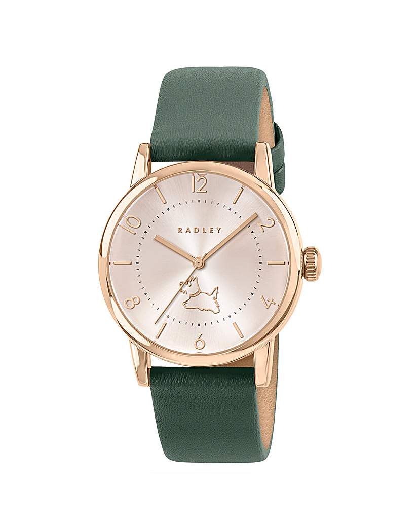 Radley Rose Gold Plated Leather Watch Radley Spring Street Hunter Green Leather Strap Watch. Spring Street features round 35mm case fitted with a domed lens for the ultimate clarity. The polished rose gold case surrounds a warm rose gold satin dial with fine detailing. The Hunter green genuine leather strap adds a warm and sophisticated finish. Fastened with a tradtional polished rose gold buckle. Polished Rose Gold Presented in Official Radley Packaging Dimensions: 17.5 x 3.5 x 1