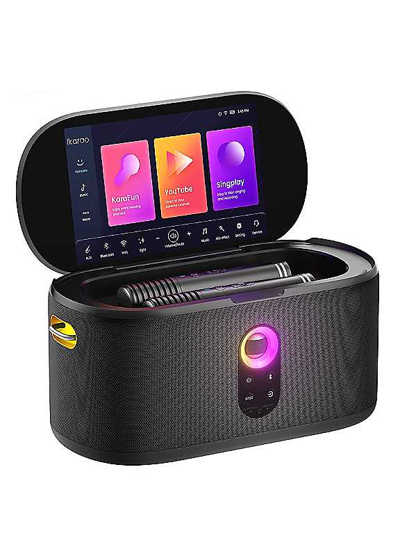 Whether it's a garden gathering, spontaneous sing-along, or a weekend away, the Ikarao Shell S1 brings people together through sound. Compact, stylish, and packed with features, it's your go-to portable speaker for turning any moment into a musical experience. Designed to deliver immersive, high-fidelity audio, the Shell S1 makes karaoke, music streaming, and public performances effortlessly enjoyable.Its 10.1-inch HD touchscreen makes navigating settings or following lyrics effortless. With pre-installed apps such as Karafun, YouTube, Spotify, and more, you can access thousands of karaoke tracks or stream your favourite music with ease.The Shell S1 comes with two professional wireless microphones that deliver clear, stable audio with a range of up to 10 metres. Boasting a 30-hour battery life, they allow you to sing or speak with confidence. The microphones also charge automatically within the unit for added convenience. With additional effects and customisable settings for echo and reverb, you can always guarantee a professional set-up tailored to your voice and environment.In addition to using apps, you can stream music via Bluetooth from your smartphone, with song details displayed on the screen. Other connection options include a USB input for playing media content directly from a USB flash drive.The HDMI output allows seamless connection to any TV or large screen, enhancing your karaoke or music experience when sharing with friends.Included with the Ikarao is a six-month free subscription to the Karafun app, giving access to over 50,000 songs across all genres. Within the app, you can customise lead and backing vocals, and even change the key of a song.The Shell S1 features a built-in rechargeable battery, making it perfect for use on the go. With up to 8 hours of playback (screen and lights off), it's ideal for outdoor use - whether you're in the garden, at the park, the beach, or a picnic.The Shell S1 also features versatile connectivity options, including USB, AUX, HDMI, and Bluetooth 5.3, enabling smooth integration with a wide range of devices. With customisable audio controls and TWS (True Wireless Stereo) compatibility for multi-speaker setups, the Shell S1 is perfect for any event - from private parties to public events or karaoke parties with friends and family - delivering powerful, immersive sound wherever you are.280 watts power outputMicrophone volume controlEcho effects controlRechargeable battery poweredAccessories: 2 microphones includedRuns for up to 8 hoursBatteries required: 1 x Li-Ion batteries (included)Dimensions approx. 17.5H x 35.3W x 17D cm