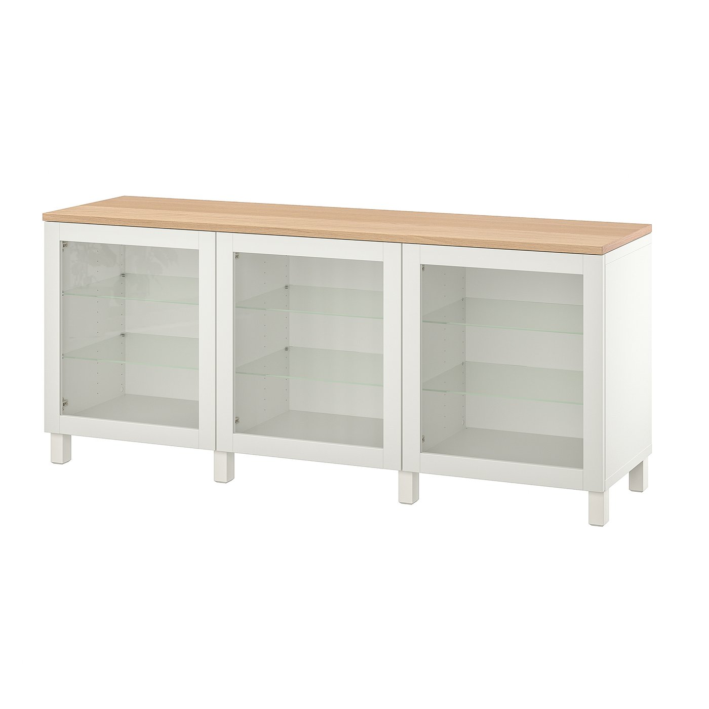 BESTÅ storage combination with doors, white/Sindvik/Stubbarp white clear glass, 180x42x76 cm, Top panel/ Bottom panel/ Side panel: Particle- and fibreboard with honeycomb paper filling. Go ahead and put things aside for a while! A sideboard combination gives you plenty of space to store things and a surface to create an attractive display - or to unload serving dishes while you eat.