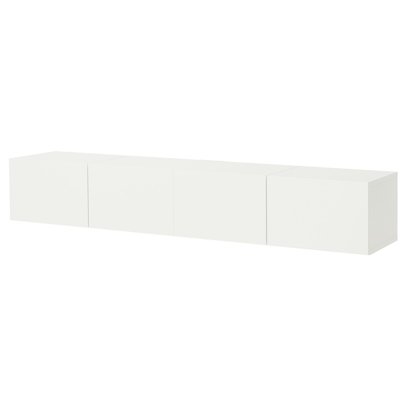 BESTÅ TV bench with doors, white/Lappviken white, 240x42x38 cm, Top panel/ Bottom panel/ Side panel/ Partition: Particle- and fibreboard with honeycomb paper filling. Plenty of storage and easy cable management. This wall-mounted TV bench combines 3 frames into a stylish and functional solution. Generous width makes it perfect for a larger TV!