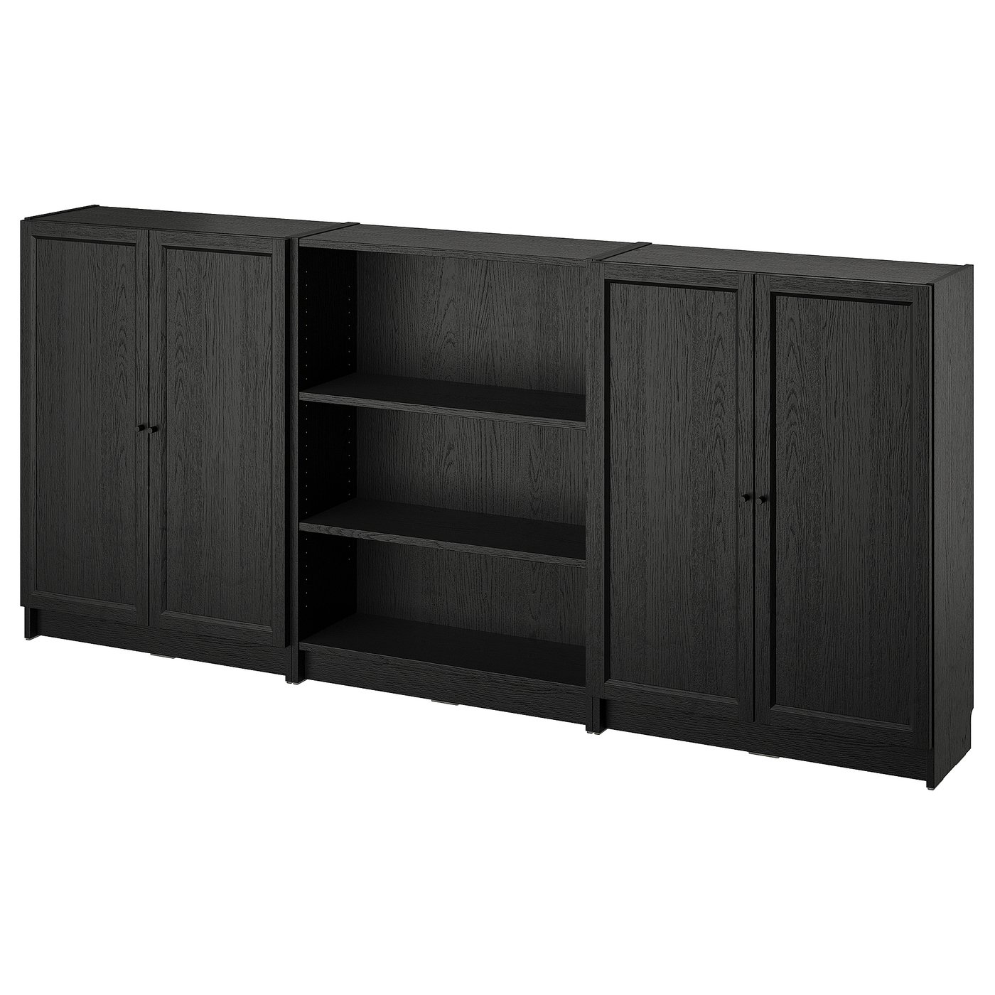 BILLY / OXBERG bookcase combination with doors, black oak effect, 240x30x106 cm, Basematerial/ Side panel: Particleboard. BILLY bookcase is a beloved icon that, thanks to its versatility, can be used in many ways at home. Use this horizontal solution with closed and open storage as a sideboard to display nice items. | black accent cabinet, living room cabinets, office bookcase wall, free standing shelves, living room accent cabinet, home office bookshelves, home office shelves