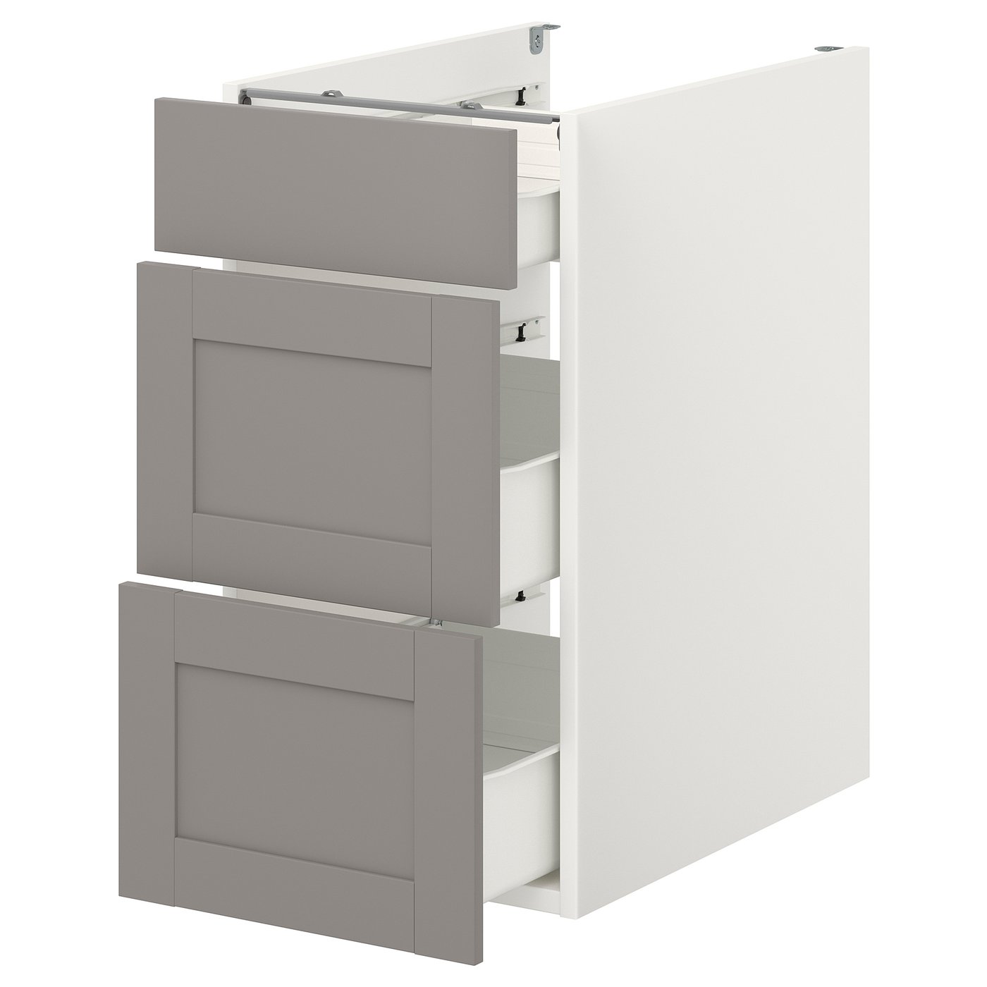 ENHET base cb w 3 drawers, white/grey frame, 40x62x75 cm, Side panel: Particle- and fibreboard with honeycomb paper filling. ENHET series makes it easy to start fresh with a new kitchen solution. This cabinet has 3 handy drawers for your pots and utensils, paired with grey framed fronts that feel warm and inviting.