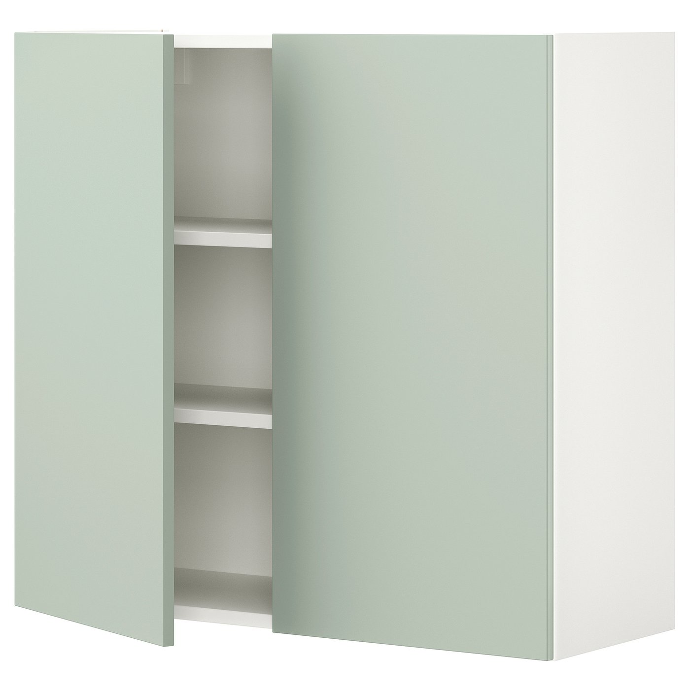 ENHET wall cb w 2 shlvs/doors, white/pale grey-green, 80x32x75 cm, Side panel/ Bottom panel/ Top panel/ Shelf: Particleboard. ENHET series makes it easy to start fresh in the kitchen, bath or laundry. This wall cabinet gives a good overview of bottles and jars, and the pale grey-green front creates a calm and elegant look.