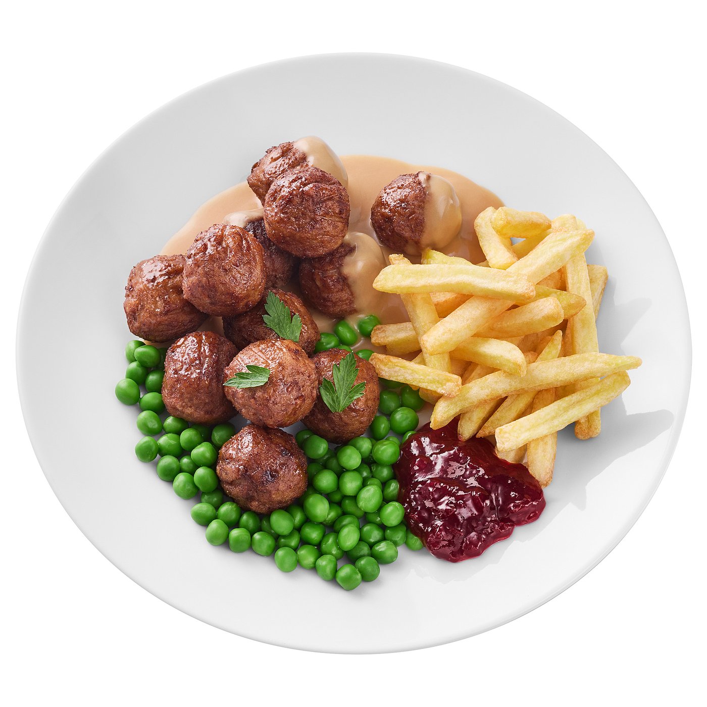 , french fries green peas/cream sauce and lingonberry jam 12 piece.