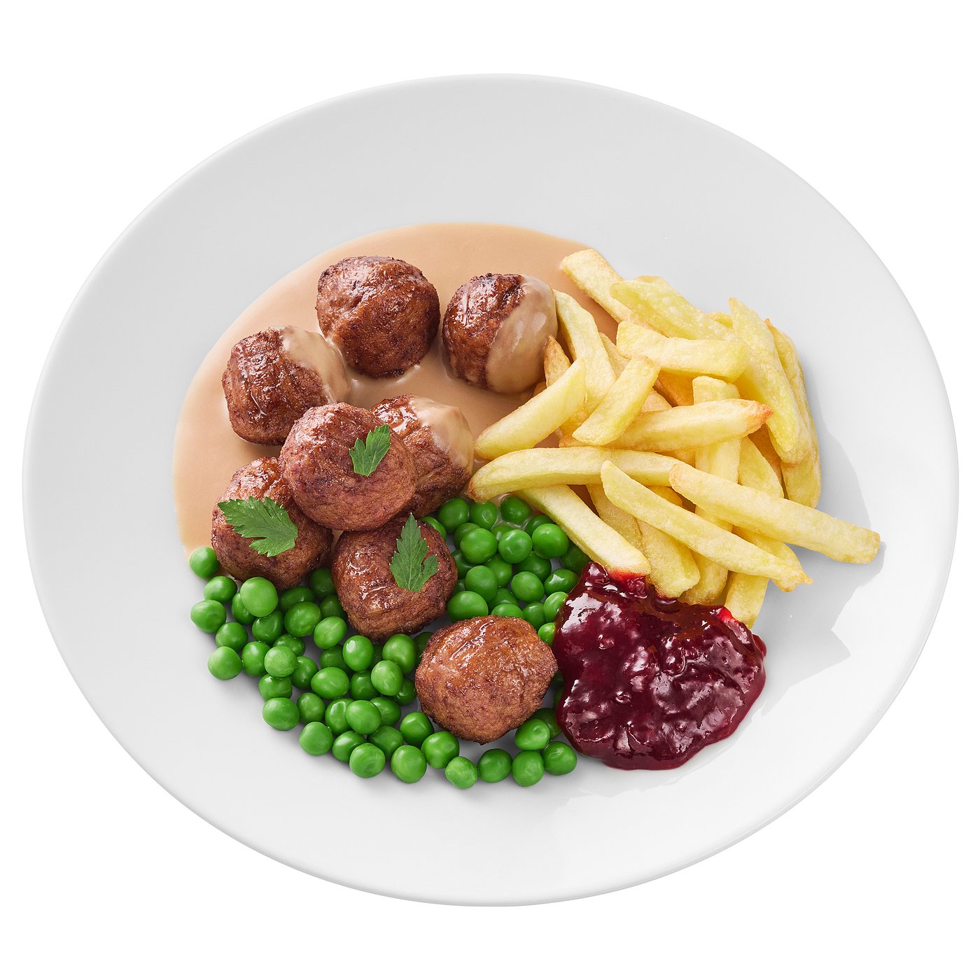, french fries green peas/cream sauce and lingonberry jam 8 piece.