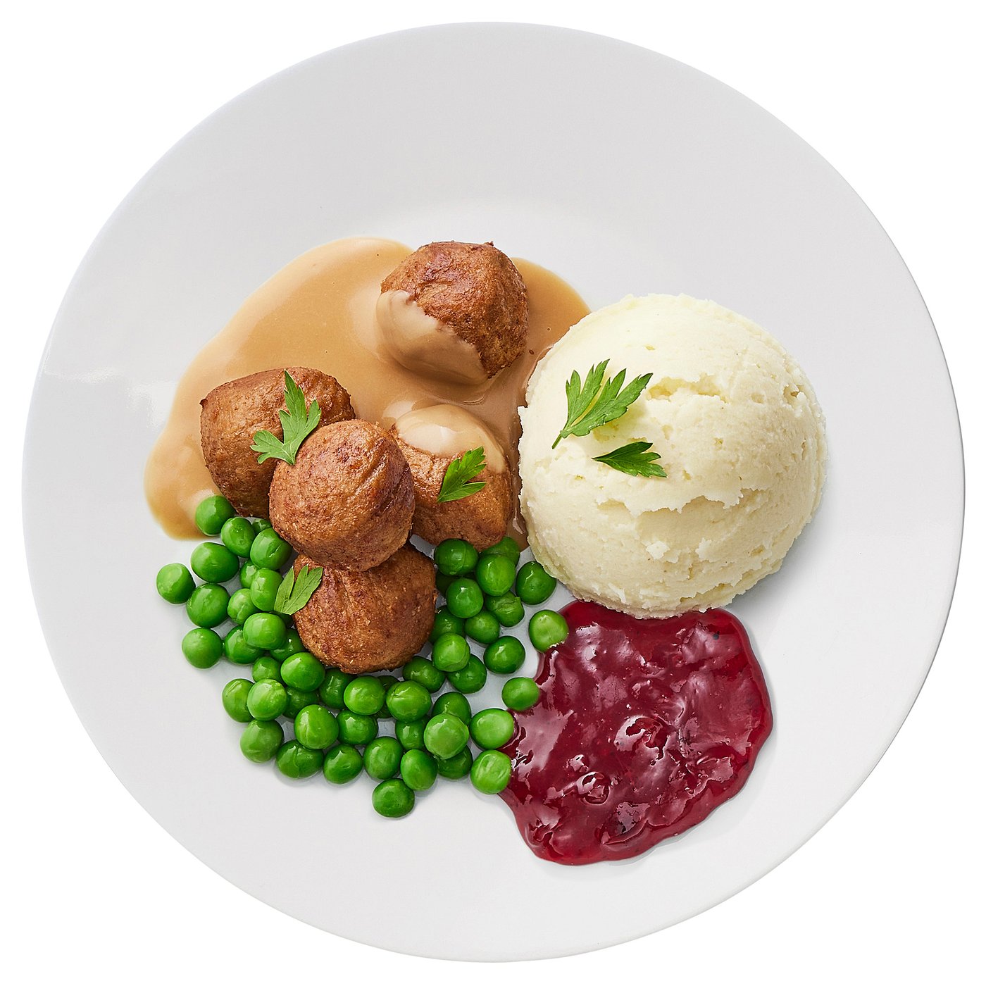 , mashed potatoes green peas/cream sauce and lingonberry jam 5 piece.