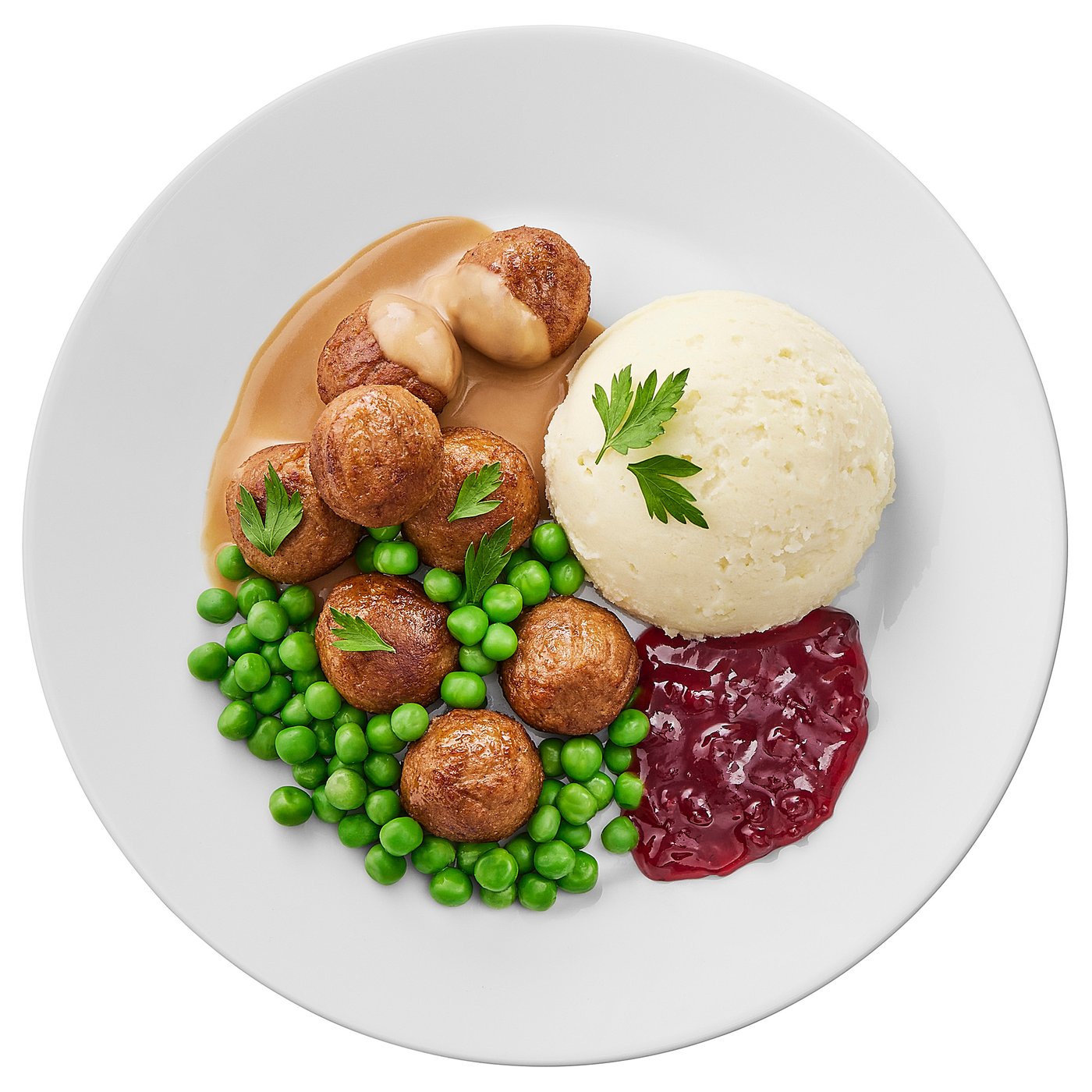 , mashed potatoes green peas/cream sauce and lingonberry jam 8 piece.