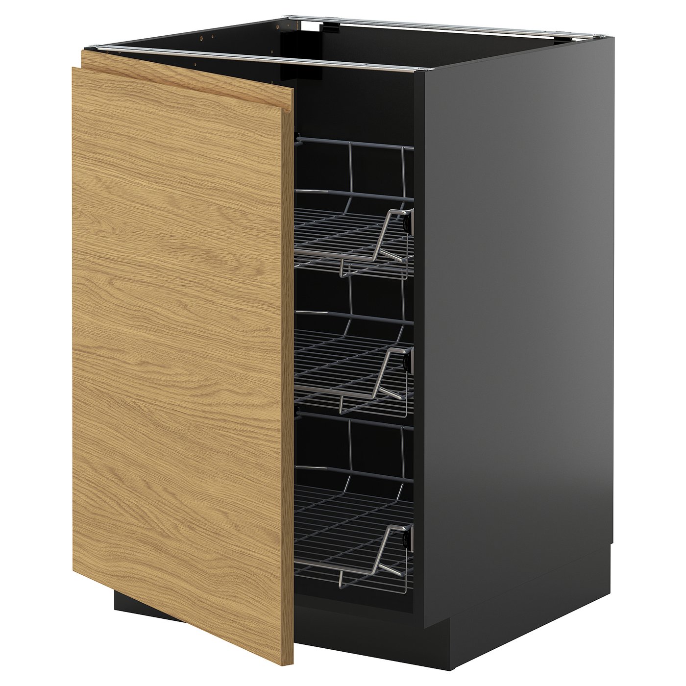 METOD base cabinet with wire baskets, black-grey/Voxtorp oak effect, 60x60 cm, Basematerial: Particleboard. METOD kitchen system gives you endless possibilities to design your dream kitchen. Paired with VOXTORP fronts with oak expression and integrated handles you get a minimalist look with a warm feel.