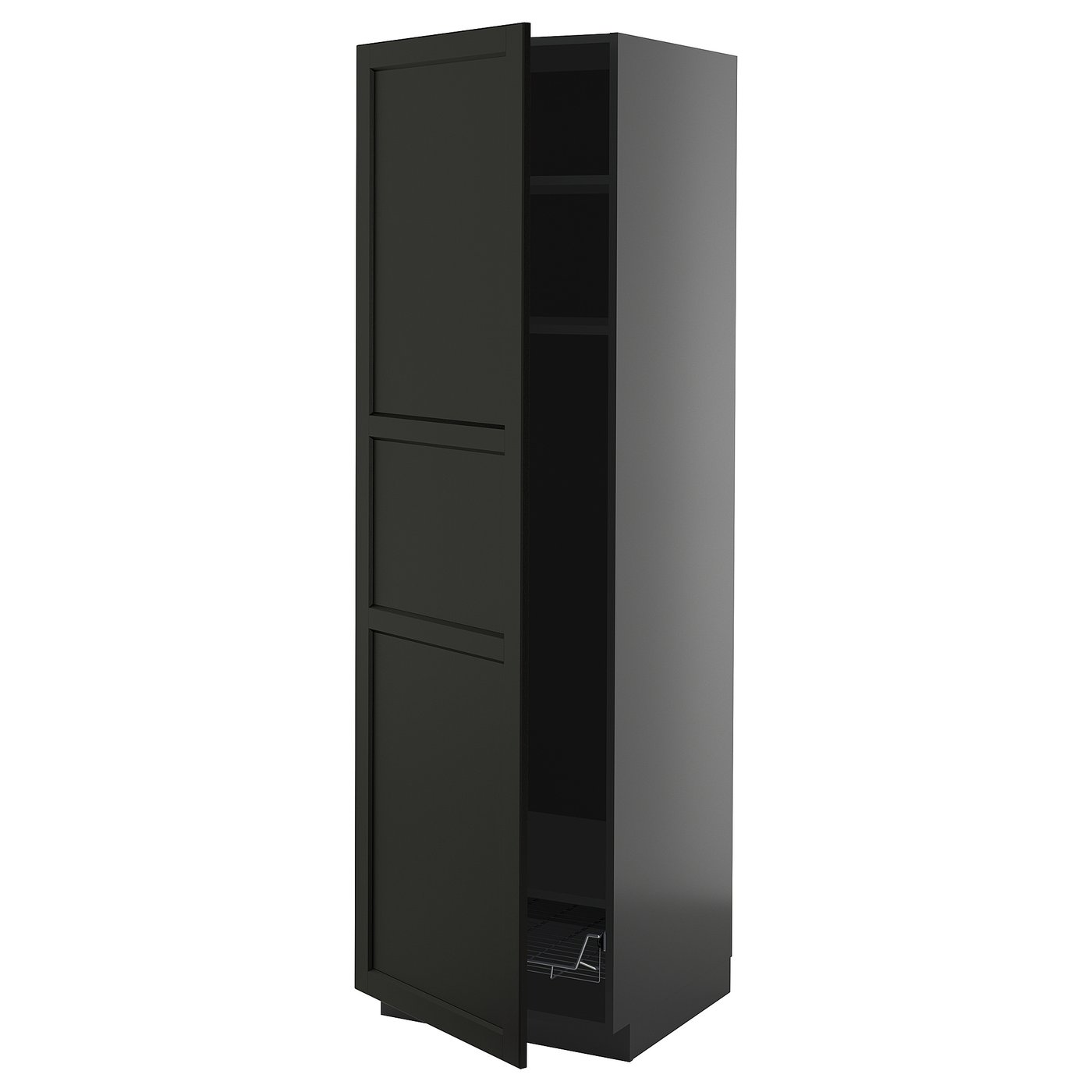 METOD high cabinet w shelves/wire basket, black-grey/Lerhyttan black stained, 60x60x200 cm, Frame: Solid ash. METOD kitchen system gives you endless possibilities to design your dream kitchen. Paired with black stained LERHYTTAN fronts with bevelled edges, your kitchen gets a warm and traditional character.