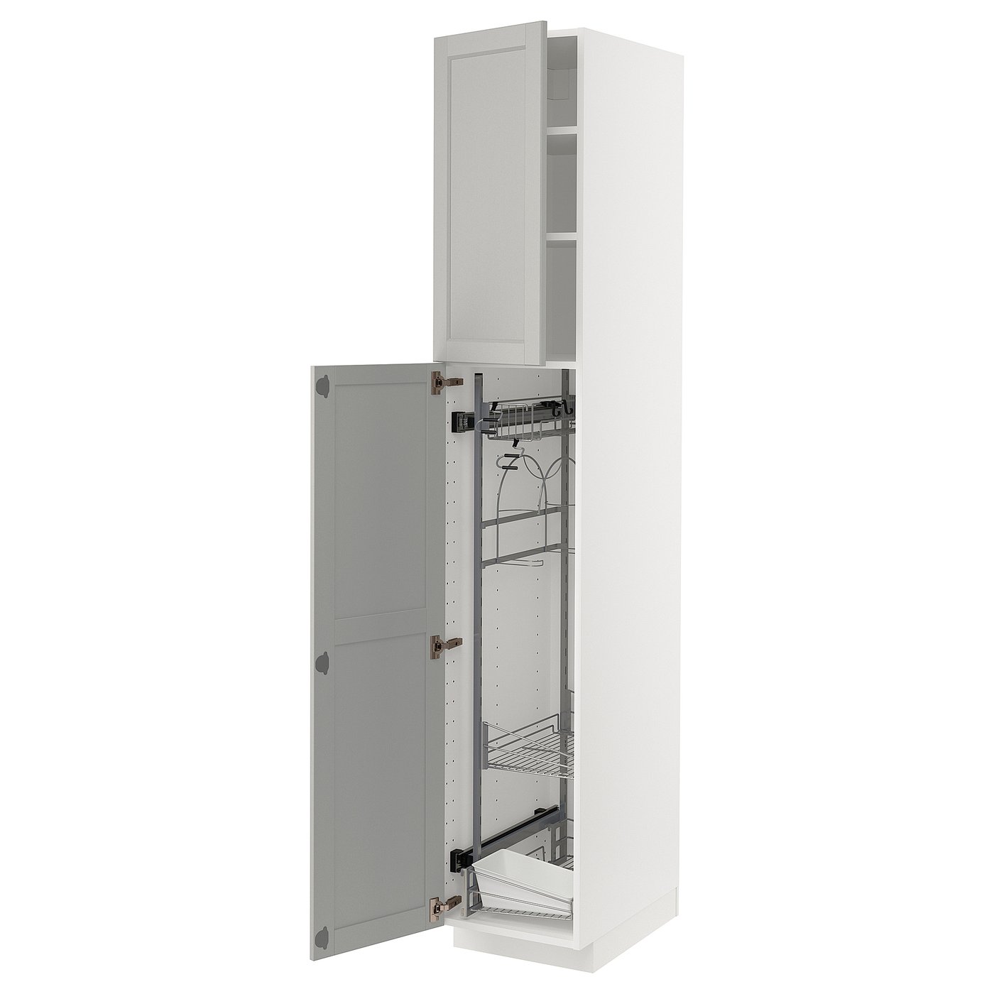 METOD high cabinet with cleaning interior, white/Lerhyttan light grey, 40x60x220 cm, Frame: Solid birch. METOD kitchen system gives you endless possibilities to design your dream kitchen. Paired with light grey LERHYTTAN fronts with bevelled edges, your kitchen gets a classic, traditional look.