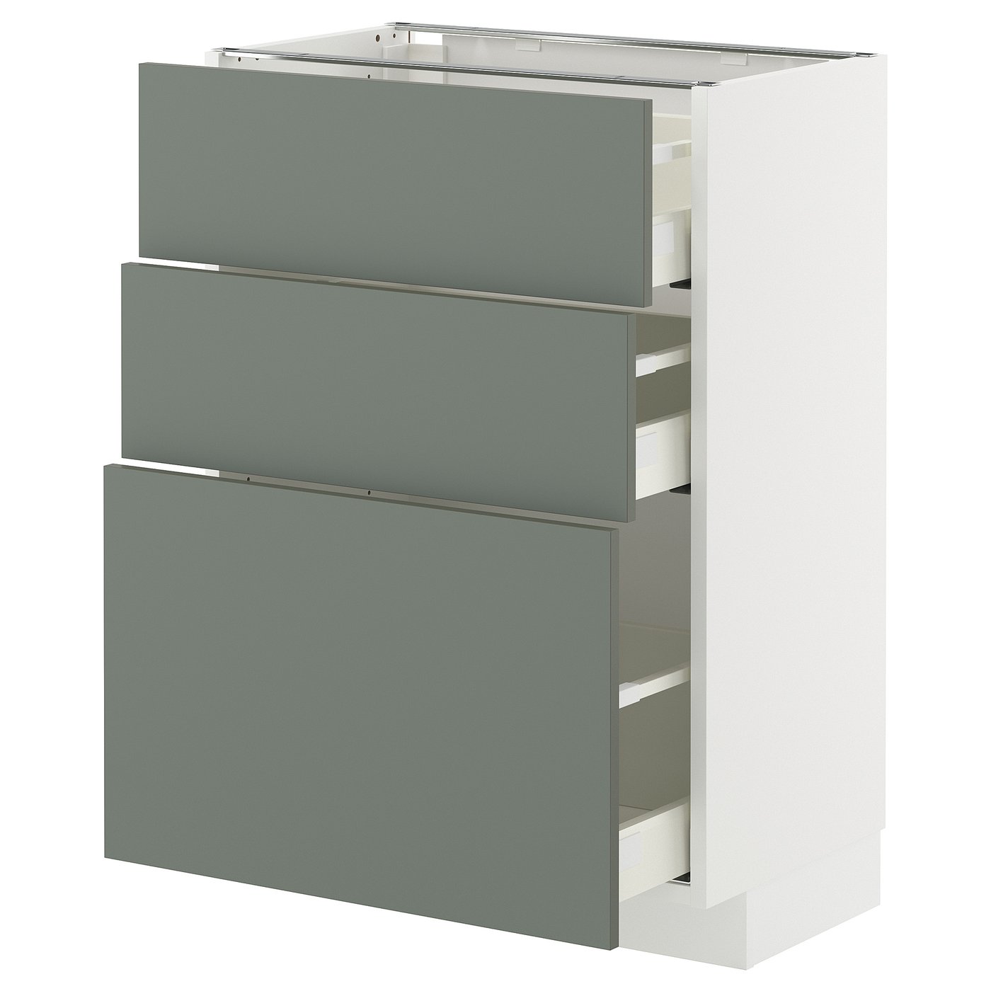METOD / MAXIMERA base cabinet with 3 drawers, white/Nickebo matt grey-green, 60x37 cm, Basematerial: Particleboard. METOD kitchen system gives you endless possibilities to design your dream kitchen. Paired with NICKEBO fronts in matt grey-green you get a harmonious and modern look that is easy to personalise.
