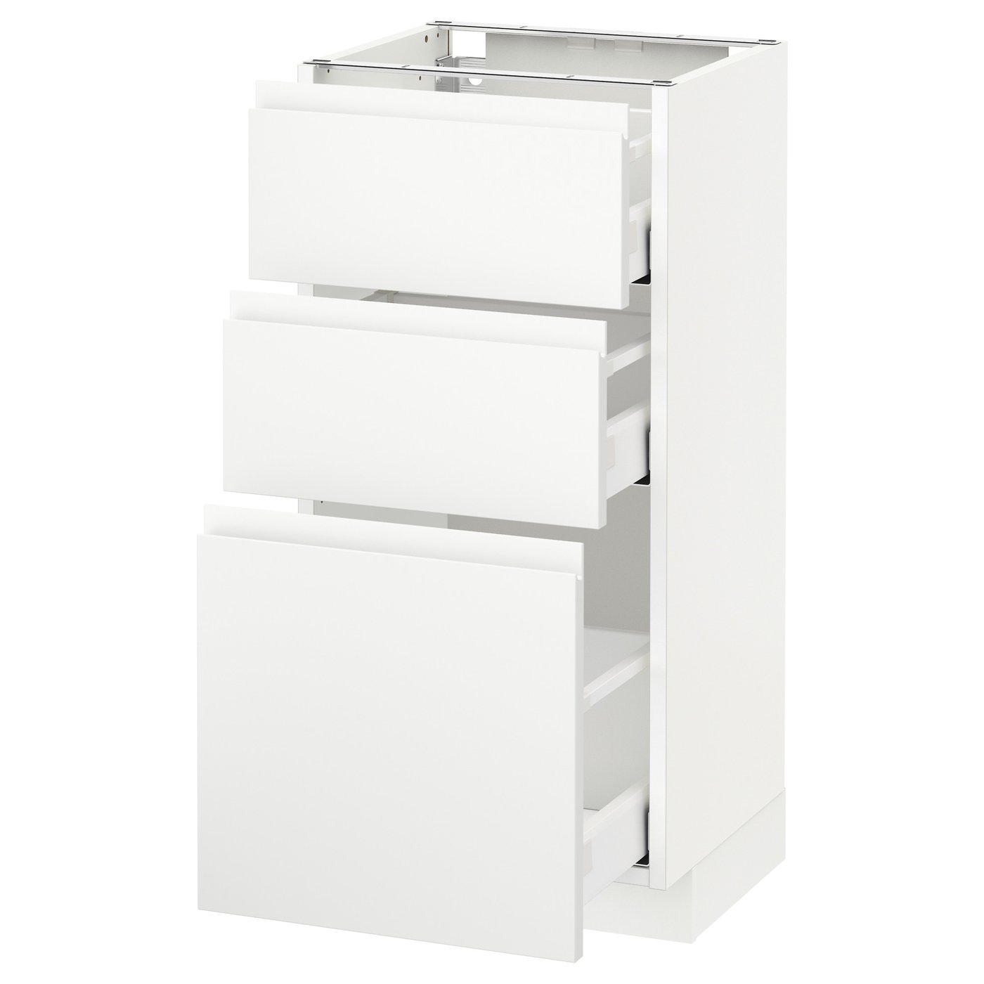 METOD / MAXIMERA base cabinet with 3 drawers, white/Voxtorp matt white, 40x37 cm, Front: Fibreboard. METOD kitchen system gives you endless possibilities to design your dream kitchen. Paired with VOXTORP fronts in matte white with integrated handles, you get a modern and minimalist expression.