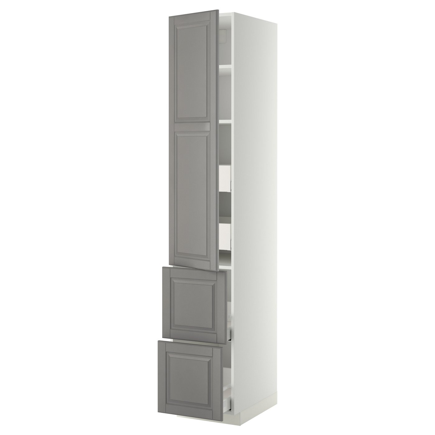 METOD / MAXIMERA hi cab w shlvs/4 drawers/dr/2 frnts, white/Bodbyn grey, 40x60x220 cm, Fibreboard. METOD kitchen system gives you endless possibilities to design your dream kitchen. Paired with BODBYN fronts in soft grey with bevelled edges you create a traditional look with a warm and welcoming feel.