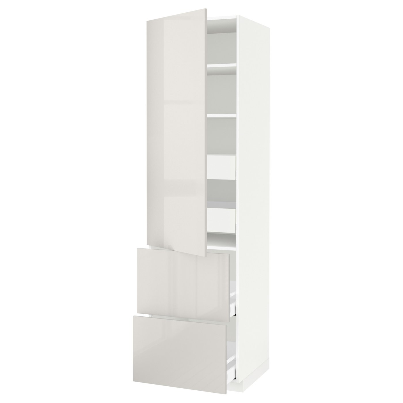 METOD / MAXIMERA hi cab w shlvs/4 drawers/dr/2 frnts, white/Ringhult light grey, 60x60x220 cm, Front: Particleboard. METOD kitchen system gives you endless possibilities to design your dream kitchen. Paired with RINGHULT high gloss grey fronts, your kitchen gets a modern and spacious feel and is easy to wipe clean.
