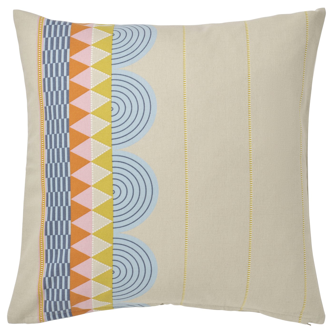 OMMJÄNGE cushion cover, multicolour, 50x50 cm, 100% cotton. The mix of lines, circles and triangles in muted tones gives this cushion cover in soft cotton a striking expression. Part of the OMMJÄNGE collection – modern design inspired by Swedish folk art.