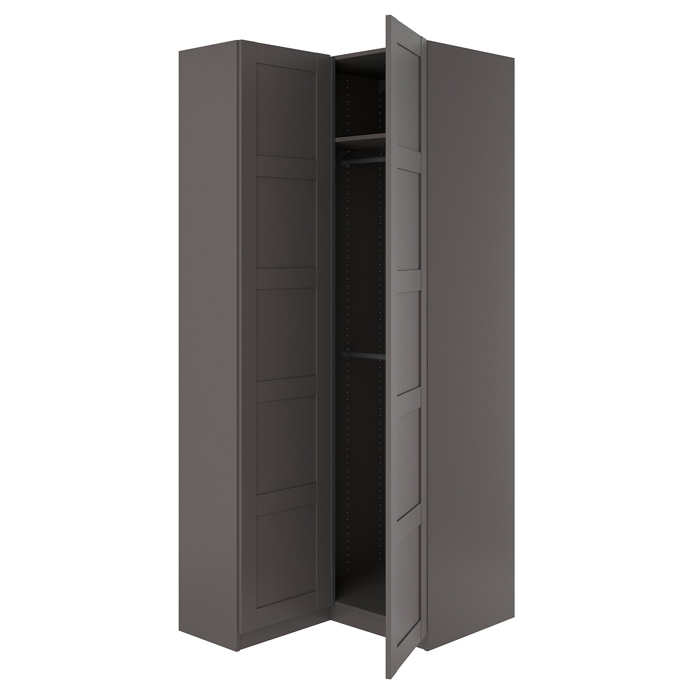 PAX / BERGSBO corner wardrobe, dark grey/dark grey, 111/88x236 cm, This furniture must be fixed to the wall with the enclosed wall fastener, Different wall materials require different types of fixing devices. Use fixing devices suitable for the walls in your home, sold separately, Two persons are needed for the assembly of this furniture, The frame can be assembled in an upright position if your ceiling height is a minimum of 237 cm. Follow the assembly instructions in the package, Interior accessories that help you organise inside your wardrobe are sold separately, Knobs and handles are sold separately, Hinges are needed for this product. They are included in the price but picked up separately, The clothes rail holds about 40 shirts on hangers, IKEA of Sweden AB SE-343 81 Älmhult, IKEA.com, 10 year guarantee. Read about the terms in the guarantee brochure. You can easily adapt this ready-made PAX/KOMPLEMENT combination to suit your needs and taste using the PAX planning tool. Adjustable feet make it possible to compensate any irregularities in the floor. Hinges with integrated dampers catch the door and close it slowly, silently and softly. With the PAX Planner, you can easily complete your combination with integrated lighting. After choosing the light source, the planner will work out which accessories you need to complete the solution. Do you know it's easy as pie to move around the inside organisers after taste, or change them later on? With small changes you can alter the storage solution to fit your clothes, instead of the other way around, Particleboard. Keep it simple. Here's a basic solution to get you started, and space for more interiors if you want to upgrade.