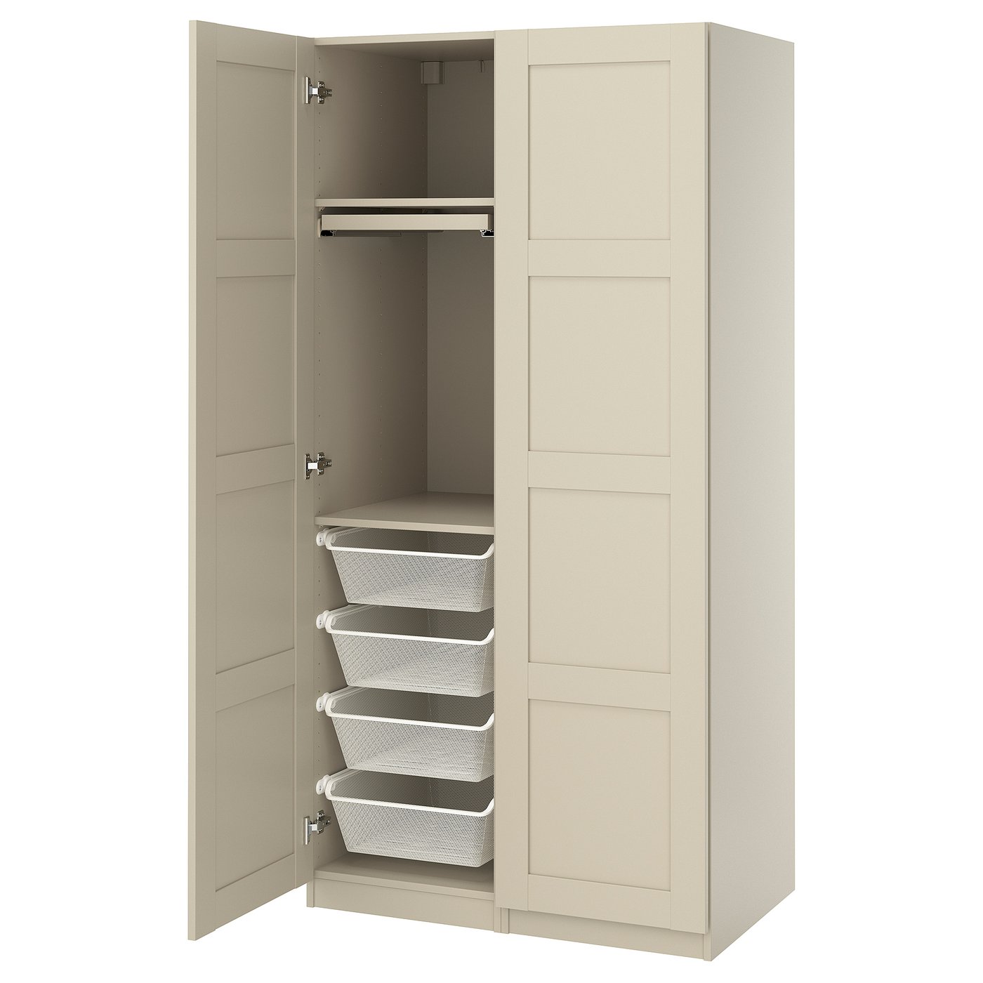 PAX / BERGSBO wardrobe combination, grey-beige/grey-beige, 100x60x201 cm, Fibreboard. Your wardrobe needs to work with what you put in it. Here's a compact combination with both drawers for smaller organising and baskets for all that needs a more airy storage.