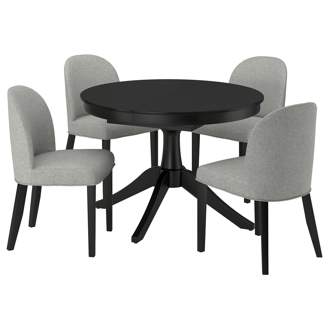 ROSENTORP / ROSENTORP table and 4 chairs, black/Tibbleby beige-grey black, 110/155 cm, Table top/ Extension leaf: Particleboard. Self-storing butterfly extension leaf. The hidden leaf easily extends seating from 4 to 6 in seconds, with only one pair of hands needed. The sturdy legs are crafted from solid wood and paired with a smooth, easy-to-clean melamine tabletop. Both are finished with multiple layers of paint to withstand everyday wear and tear. The round shape of the table makes it great for socialising since everyone can see each other. A round table allows easy movement, with no sharp corners – ideal also for tighter dining spaces. When extended, the round table transforms into an oval shape, providing extra room for guests and serving dishes. Comfy, fully upholstered chair in beige-grey Tibbleby fabric, a soft, dope-dyed polyester fabric with a subtle lustre and a discreet herringbone pattern. The seat and back are filled with comfortable foam and covered with a durable yet soft and snug fabric that allows you to enjoy every moment at the table. Upholstered chair seat distributes your body weight and reduces pressure on the sitting bone. After lively meals, it's nice to know that you can easily pull the chair cover off and machine wash it. The chair's upholstered seat and back are delivered as one piece which easily attaches to the frame with the touch-and-close fastenings. Stable and durable frame made of solid wood. With regular airing or washing, you keep your cover fresh and clean, and also reduce the amount of dust and dirt in your living space. | round dining table, pedestal dining table, wooden dining table, dining table with chairs, dark wood dining, neutral dining chairs, extendable dining table, traditional dining table, black dining table, dining table chairs, dining table black, table leaf extension, pedestal table legs, dining table 4, dining chair, 4 chairs and table, dining room chairs, wooden table and chairs, dining table and 4 chairs, round table with chairs, wooden table chairs, upholstered dining chairs, round table chairs, dining table 4 chairs