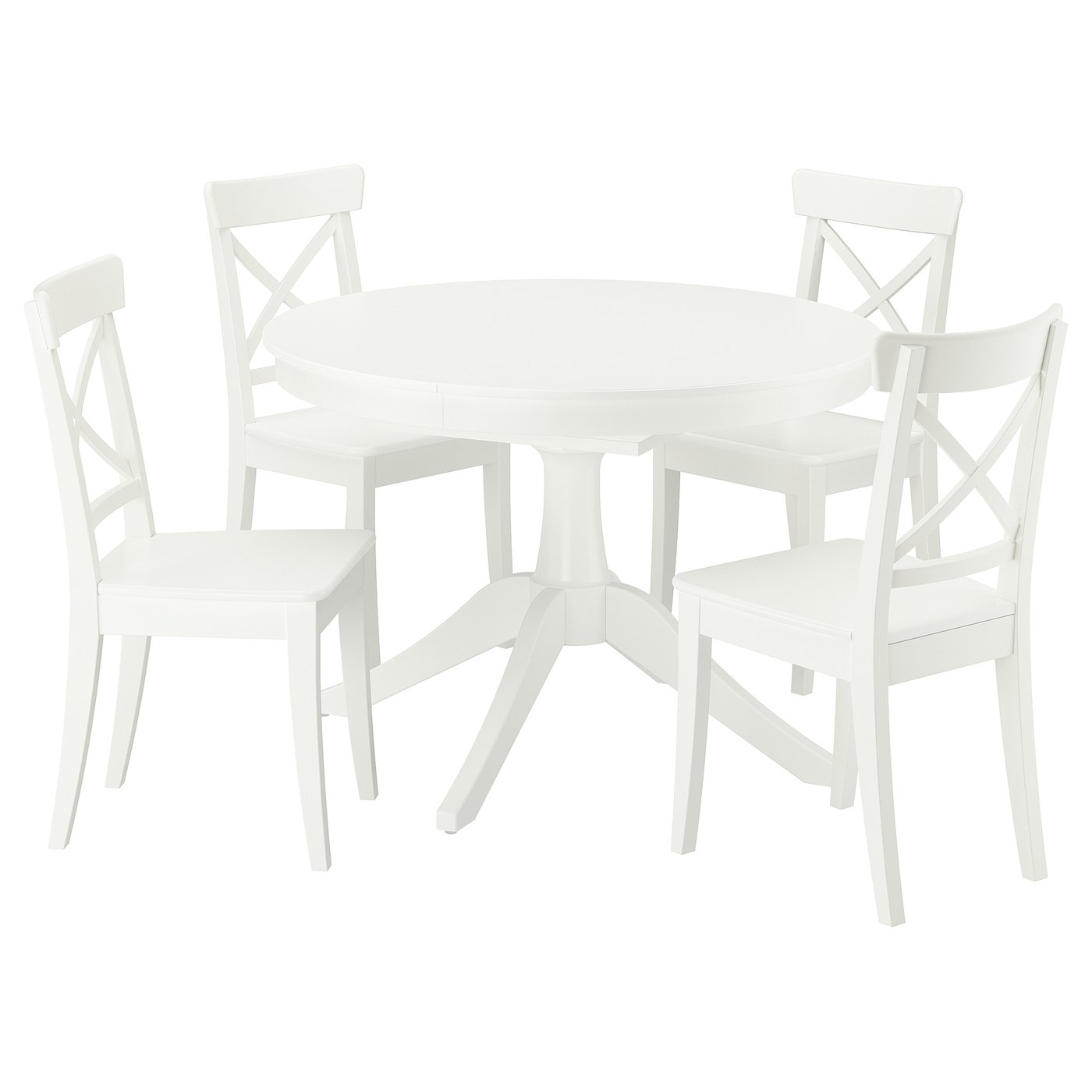 ROSENTORP / ROSENTORP table and 4 chairs, white/white, 110/155 cm, Table top/ Extension leaf: Particleboard. Self-storing butterfly extension leaf. The hidden leaf easily extends seating from 4 to 6 in seconds, with only one pair of hands needed. The sturdy legs are crafted from solid wood and paired with a smooth, easy-to-clean melamine tabletop. Both are finished with multiple layers of paint to withstand everyday wear and tear. The round shape of the table makes it great for socialising since everyone can see each other. When extended, the round table transforms into an oval shape, providing extra room for guests and serving dishes. A round table allows easy movement, with no sharp corners – ideal also for tighter dining spaces. A side chair is ideal for smaller spaces as the armless silhouette allows it to slide effortlessly under the table when not in use. For a softer seat or to add a personal touch to the room, complete with a chair pad in the style and colour of your choice. Sturdy and durable chair frame made of solid hardwood. | round dining table, pedestal dining table, wooden dining table, dining table with chairs, neutral dining chairs, extendable dining table, traditional dining table, table with leaf, classic dining table, wood dining table, white dining table, round table chairs, dining table chairs, traditional dining, wooden table chairs, dining chair, 4 chairs and table, dining room chairs, wooden table and chairs, dining table and 4 chairs, round table with chairs, dining table and chairs, white table with chairs