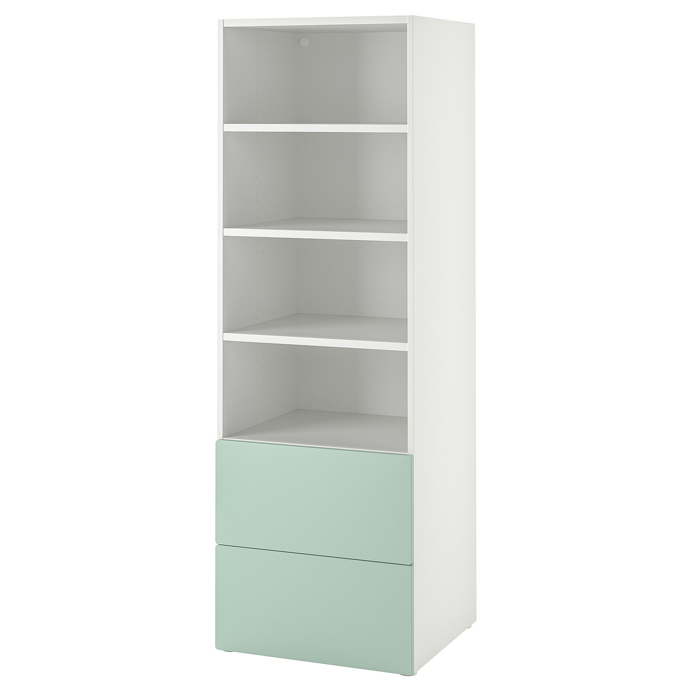 SMÅSTAD / PLATSA bookcase, white light green/with 2 drawers, 60x57x181 cm, Fibreboard. This bookcase has lots of storage in a small space – from baby years to teens. On the open shelves you can display and have things close at hand, and in the drawers there is room for things of all sizes.