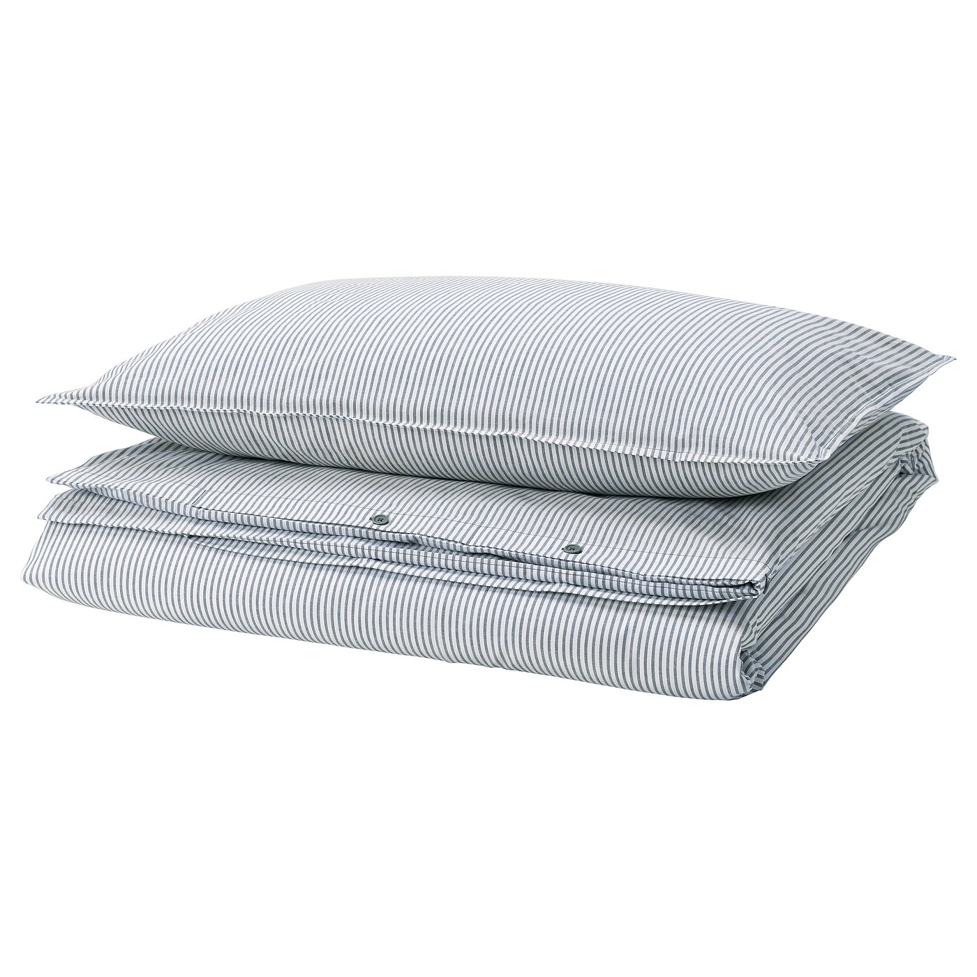 SOLFIBBLA duvet cover and pillowcase, white blue/stripe, 150x200/50x80 cm, 100% cotton. SOLFIBBLA duvet cover set is made from soft 100% cotton with clear, timeless blue and white yarn-dyed stripes. The thicker yarn adds a cosy, handcrafted vibe with a hint of vintage charm to your bedroom. | 100 cotton duvet, duvet cover 200x200, cotton duvet sets, 100 cotton pillow, white cotton pillowcases, cotton duvet cover, 100 cotton pillowcase