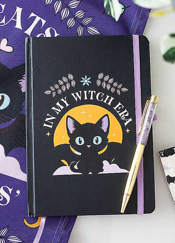 Jot down spells, thoughts, or to-do lists with this A5 notebook featuring the phrase 'In My Witch Era' and a bat-winged black cat design. Comes with an amethyst chip pen for an extra mystical touch. 100 sheets / 200 lined pages.