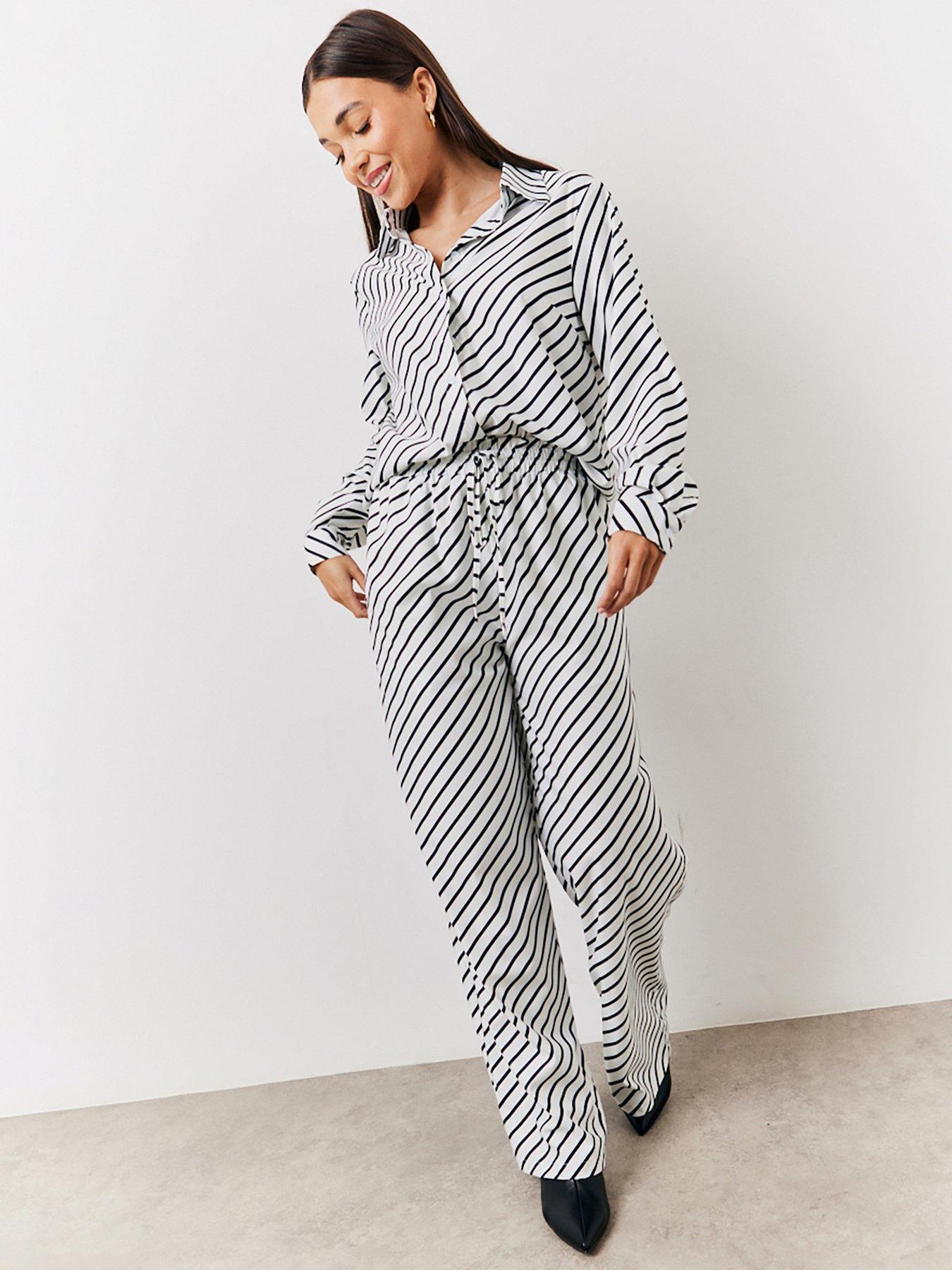 In The Style Striped Trouser Size & Fit True to size - order your usual size Wide leg fit Long length Available in sizes 6 - 16 Details Striped Trouser by In The Style Cream Drawstring waistline Striped design Side slip pockets High rise