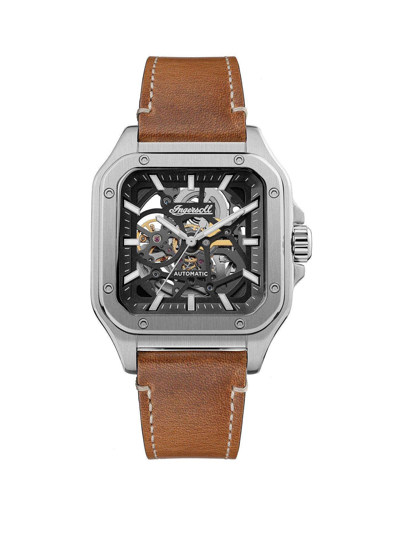 Ingersoll Gents Automatic Watch, Black Dial Square Stainless Steel Case And Leather Strap - Brown -