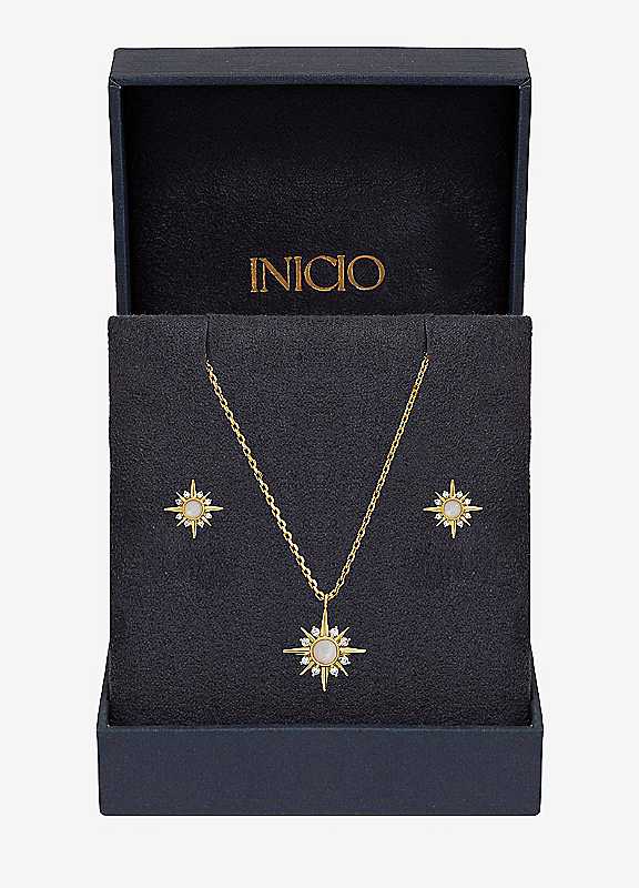 Our Inicio 14K Gold Plated Cubic Zirconia Star Set is a must have gorgeous trend driven set designed to make a statement. Presented in a reusable velvet Inicio gift box. Perfect for gifting.Fastening: Lobster Clasp, Post and Bullet BackWidth dimension: 15mmLength dimension: 15mmMaterial: 14K Gold Plated Base MetalCostume Jewellery