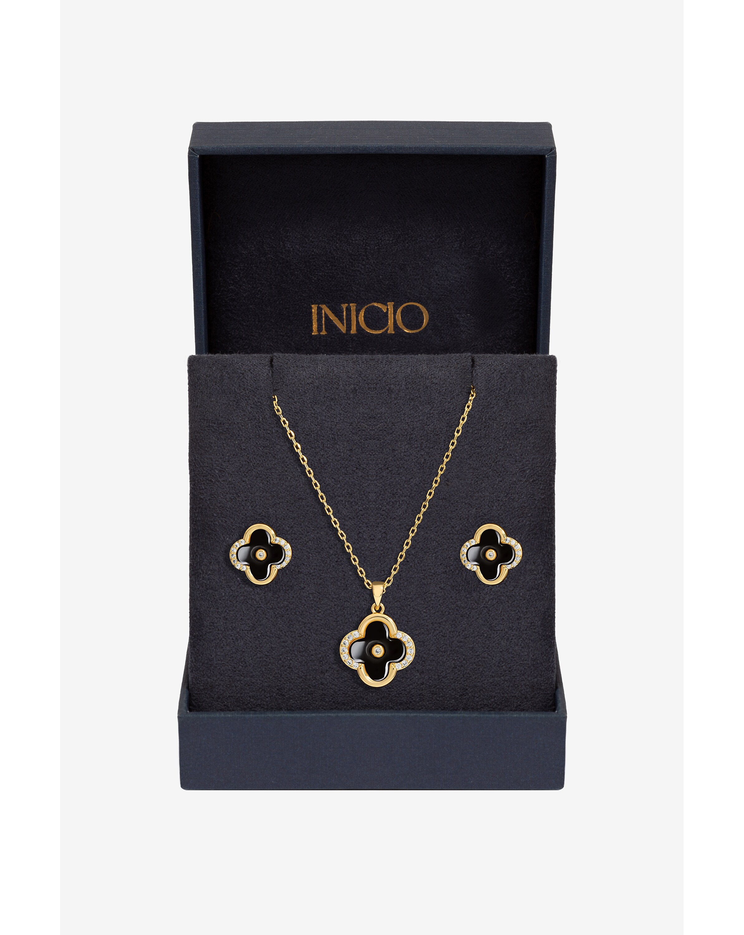 Inicio Gold Plated And Jet Enamel Clover Set - Gift Boxed