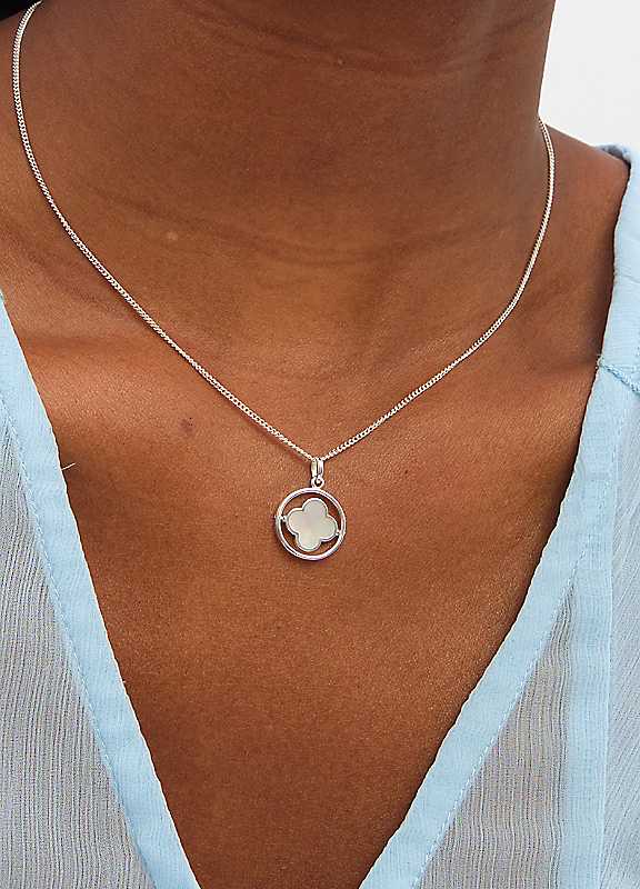 Delicate and elegant, the Inicio Mother of Pearl Spinner Clover Pendant features a shimmering mother of pearl centre set within a polished four leaf clover. The spinning design adds subtle movement, bringing a playful, modern twist to a timeless symbol of luck and positivity. Perfect for everyday wear, layering, or as a thoughtful gift for someone special.Fastening: Lobster claspCostume jewelleryComes in gift pouchSterling Silver Plated BrassWidth approx. 15 mmLength approx. 20 mm | clover pendant necklace, mother of pearl pendant, pearl pendant necklace, silver clover necklace, mother of pearl necklace, silver pendant for women