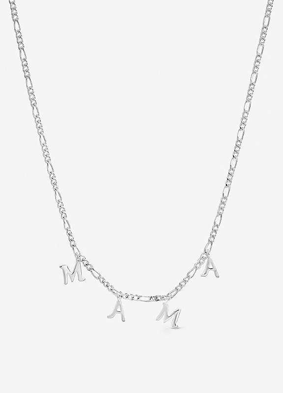 Our Inicio Mama Necklace combines timeless elegance with a meaningful touch. The polished sterling silver plated Mama necklace features letters spaced along a delicate Figaro chain, creating a chic and modern design that's both stylish and sentimental. Lightweight and versatile, it sits beautifully on the neckline, making it perfect for layering or wearing alone as a statement piece.Presented in a drawer box, ready to gift, it's the perfect way to celebrate Mother's Day, birthdays, or simply show a cherished Mum how much she means. A thoughtful keepsake she'll treasure forever.Our 3 micron sterling silver plating uses a heavy, premium layer of silver that delivers a brighter finish, greater resistance to tarnish and wear, and significantly longer lasting quality than standard plated jewellery.Fastening: Lobster claspCostume jewelleryComes in gift pouchSterling Silver Plated Brass