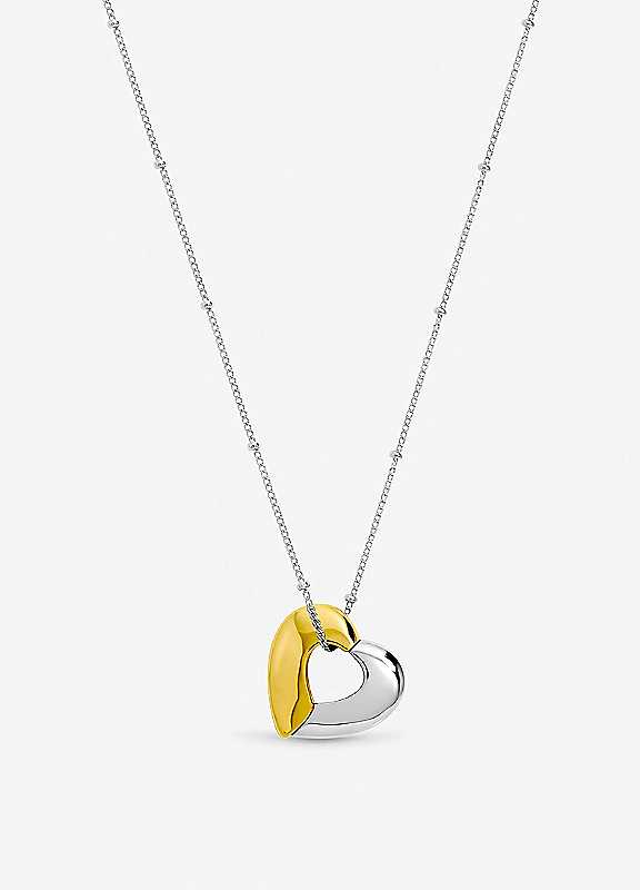 Our Inicio Two Tone Heart Necklace features a bold, sculptural heart pendant suspended from a delicate silver station chain. The polished heart design is beautifully contrasted with a modern two tone finish, blending 18ct gold and sterling silver plating. This striking piece is a contemporary take on a timeless symbol, offering versatile radiance perfect for mixing and matching with your existing Jewellery.Our 3 micron sterling silver plating uses a heavy, premium layer of silver that delivers a brighter finish, greater resistance to tarnish and wear, and significantly longer lasting quality than standard plated jewellery.Fastening: Lobster claspCostume jewelleryComes in gift pouchSterling Silver Plated Brass
