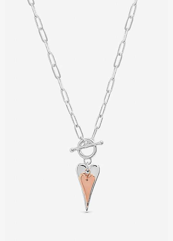 Our Inicio Two Tone T Bar Heart Necklace combines modern design with timeless charm. Crafted in polished sterling silver plating with rose gold accents, the pendant features a heart shaped charm paired with a sleek T bar closure, creating a contemporary two tone look. Lightweight and versatile, it sits beautifully on the neckline, perfect for layering or wearing alone as a statement piece.Our 3 micron sterling silver plating uses a heavy, premium layer of silver that delivers a brighter finish, greater resistance to tarnish and wear, and significantly longer lasting quality than standard plated jewellery.Fastening: T-barCostume jewelleryComes in gift pouchTwo Tone Plated BrassSize approx. 14.8W x 30L mm