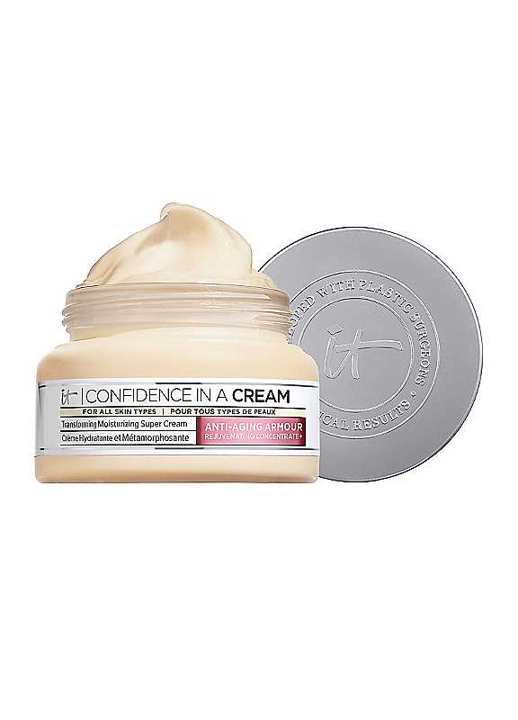 IT REVERSES TOP SIGNS OF AGING SKIN! Perfect for all skin types, including dry, sensitive, or ageing skin, Confidence in a Cream Anti-Ageing Hydrating Moisturiser helps to strengthen your skin moisture barrier over time while providing up to 48 hours of hydration.Why You'll Love It:Confidence in a Cream is our dermatologist-recommended Anti-Ageing moisturiser that works to repair the skin barrier while reversing the top signs of aging skin. - 48HR Hydration- Anti-Ageing- Skin Barrier Repair- Ophthalmologist tested- For All Skin Types Key Benefits:- In just 1 hour: This hydrating, vegan moisturiser with squalane and ceramides strengthens your skin's moisture barrier and repairs it over time.- For up to 48 hours: The quick-absorbing formula provides intense hydration, giving skin a soft, supple feel and creating the perfect base for makeup.- In 2 weeks: Our patented rejuvenating concentrate that includes niacinamide and peptide-lipid complex works to visibly brighten and firm skin and reduce the look of wrinkles. Real Beauty, Real Results:Developed with plastic surgeons' insights and dermatologists' ingredient and skincare expertise, iT Cosmetics creates problem-solving, skin-loving formulas that give you real results. How to Use:Use a penny-size amount, morning and/or night anywhere your skin needs moisture & rejuvenation. Rich cream texture quickly absorbs for skin that's instantly more hydrated & radiant-looking.