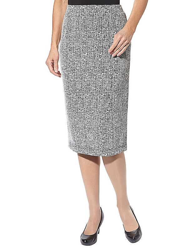 A narrow cut slip-on skirt in high-quality jacquard fabric with a boucl© look. It comes with a back vent and a comfy, fully elasticated waistband. Washable 87% Polyester, 13% Cotton Length approx. 64 cm (25¼ in)