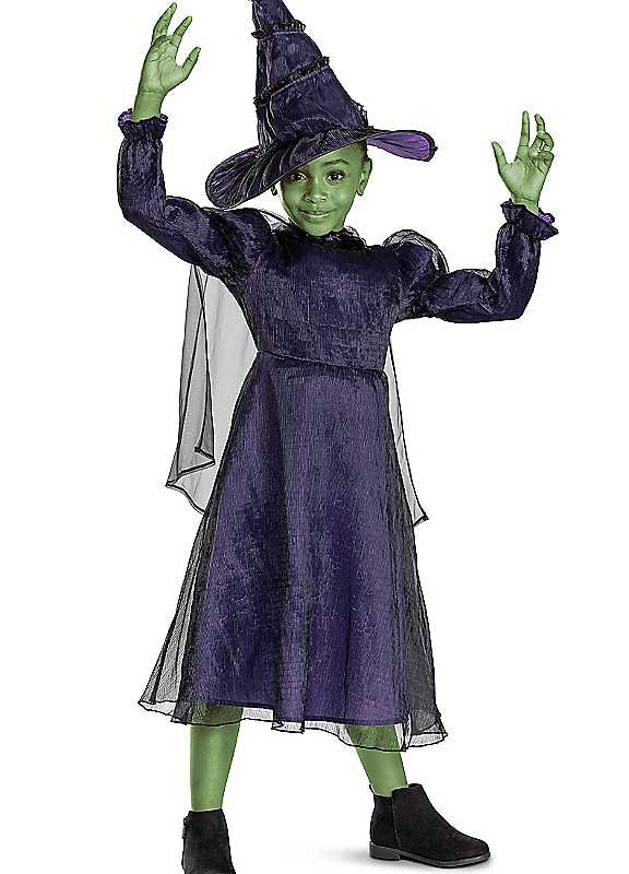 Don this spellbinding, officially licensed Elphaba Deluxe costume from Universal Pictures' Wicked that reflects her complex and powerful nature. The dress, a dark and dramatic masterpiece, is crafted from rich purple two-tone textured taffeta with an outer layer of sheer black organza, that symbolises Elphaba's connection to the Land of Oz. The dress features dimensional shoulders and long sleeves. A detachable mesh cape cascades behind you. It also comes with Elphaba's signature hat to complete the full look!Not suitable for children under 3 years old.Keep away from fire. | witch costume kids, childrens halloween costume, witch dress, fancy dress costume, dress with cape, dark purple dresses, dress with organza, dress with mesh long sleeves, taffeta dress, dress covering shoulders