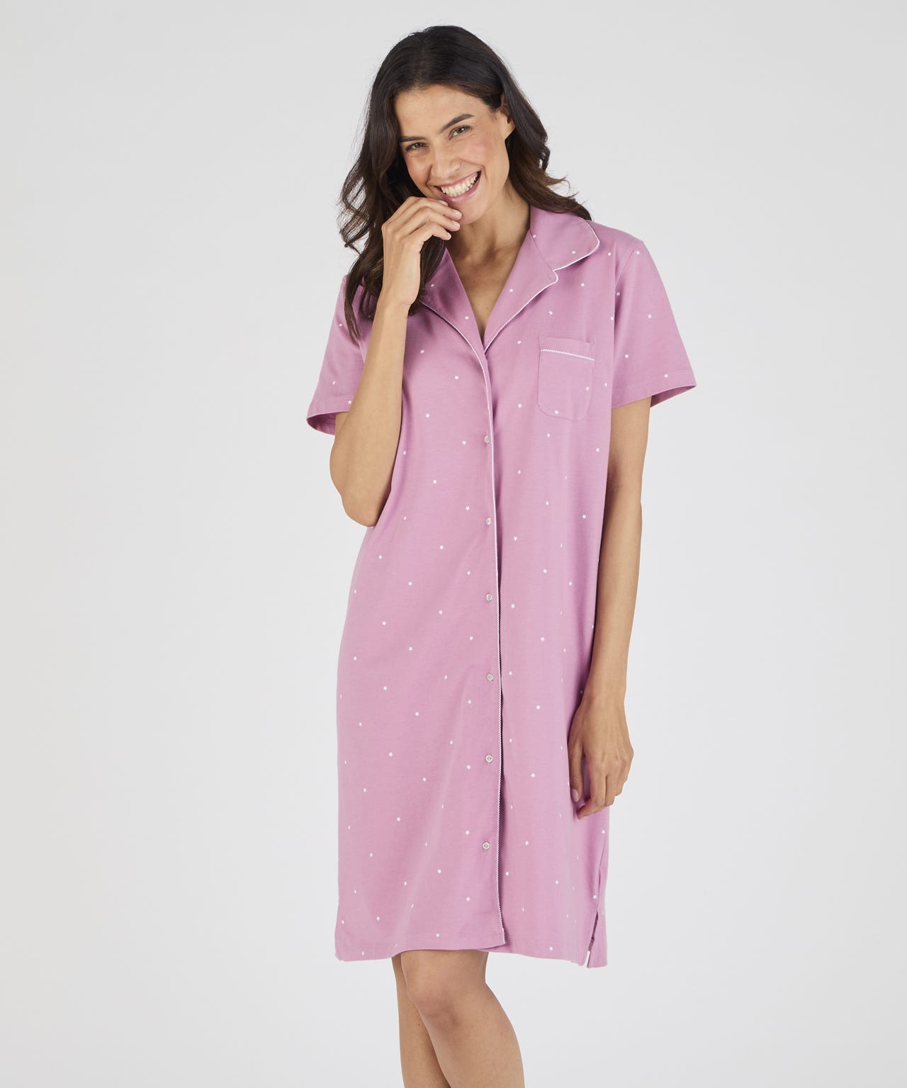 Jersey Button Through Nightdress, Mauve Star, 26/28 38"