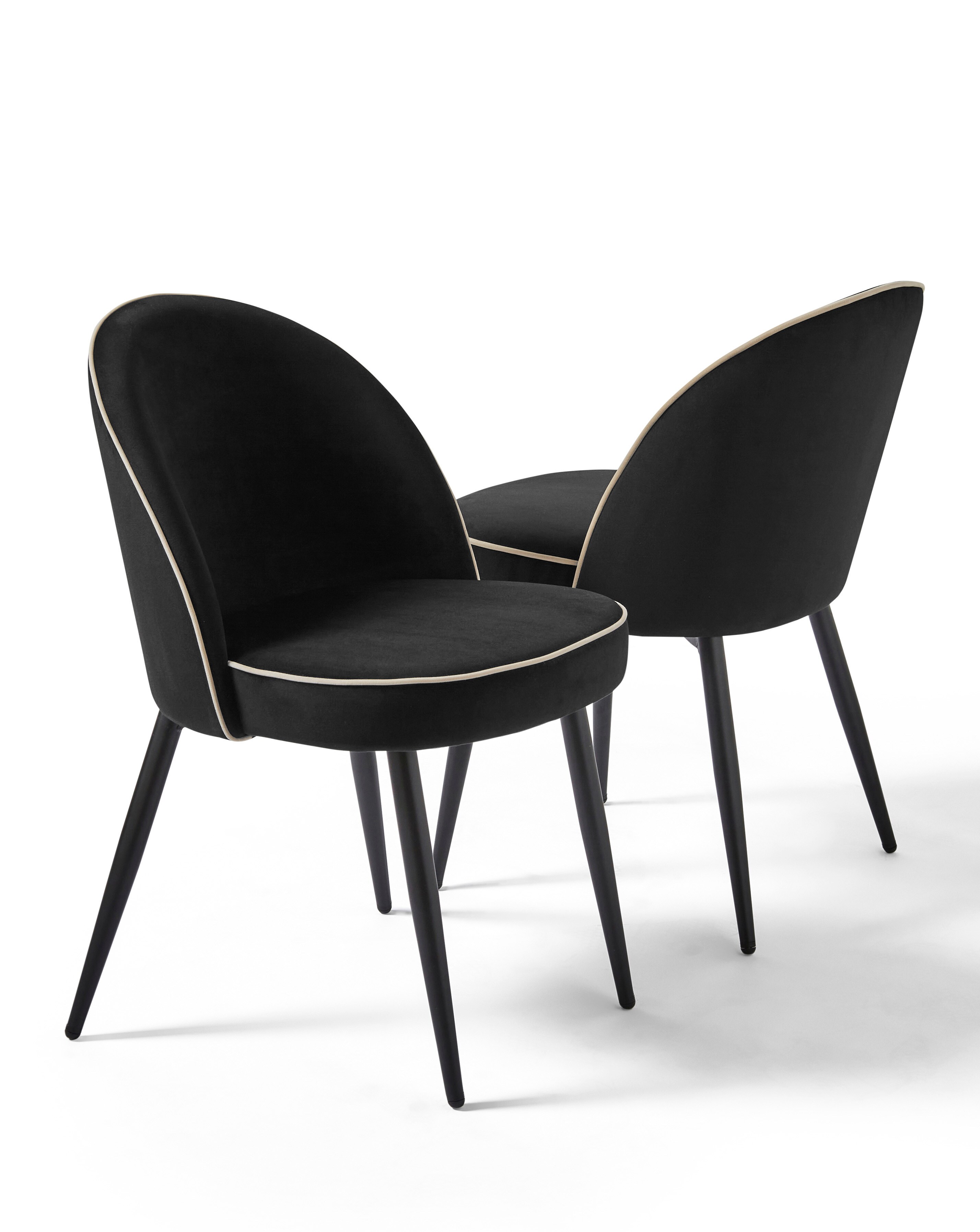 the Camille dining chairs features contrast piping to combine everyday comfort with on-trend looks. Upholstered in a neutral velvet fabric with black piping, finished with tapered black legs