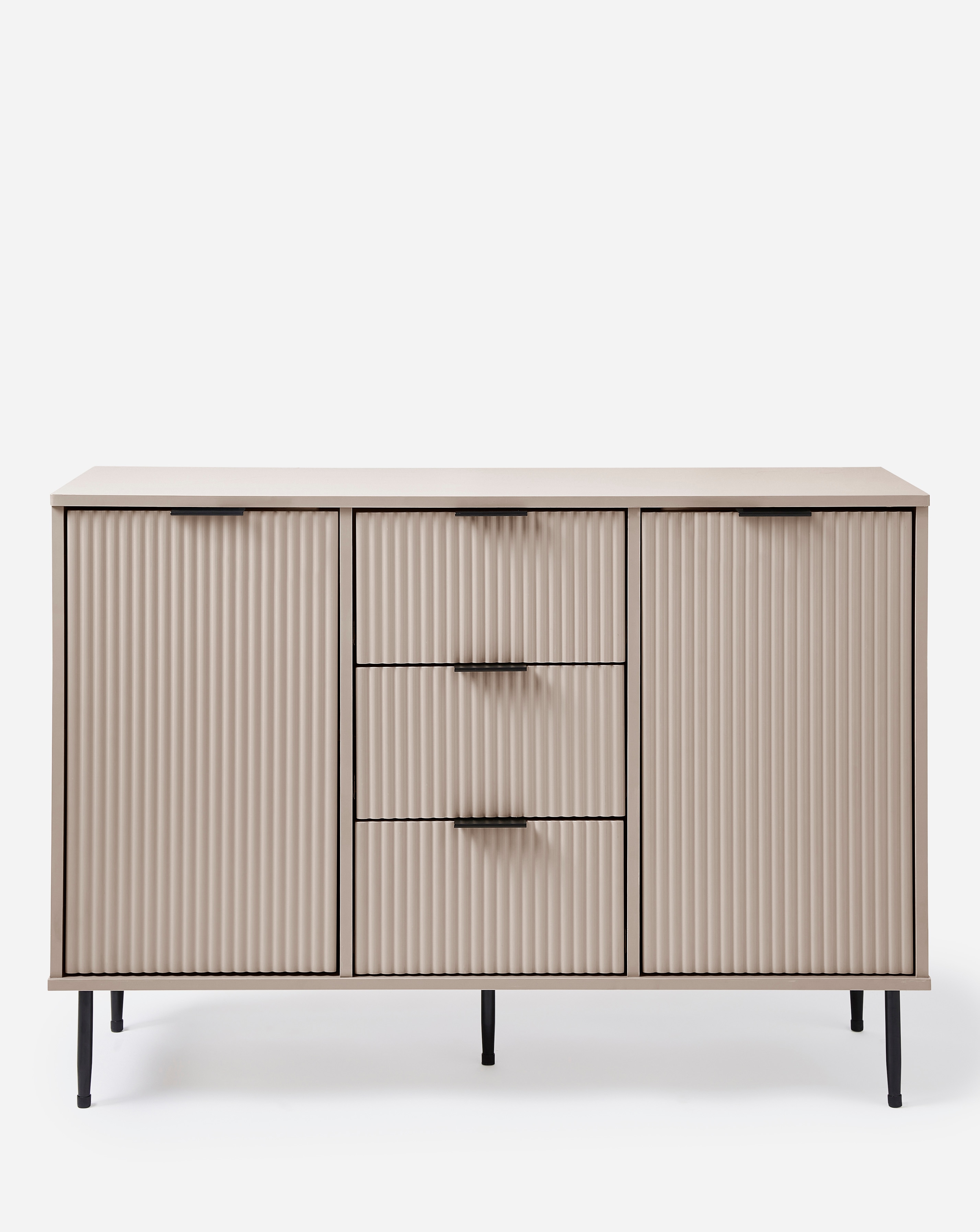 Fernley Large Sideboard. Vertical ribbed design, black legs and handles, featuring two large storage cupboards and three spacious drawers, flat packed, self-assembly required, fixtures and fittings included, 1 year Manufacturers Guarantee