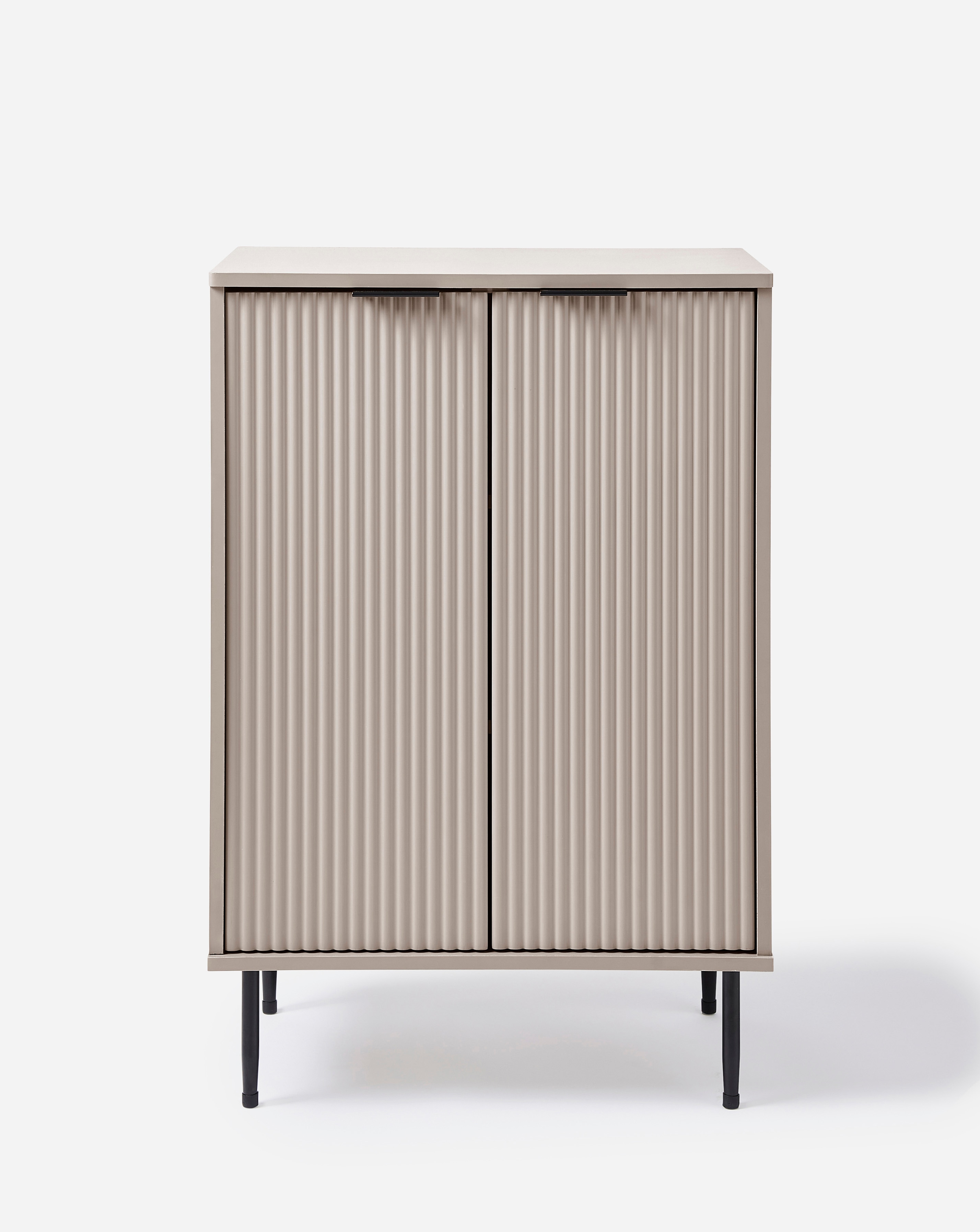 Sidebaord with vertical ribbed design and black legs and handles.