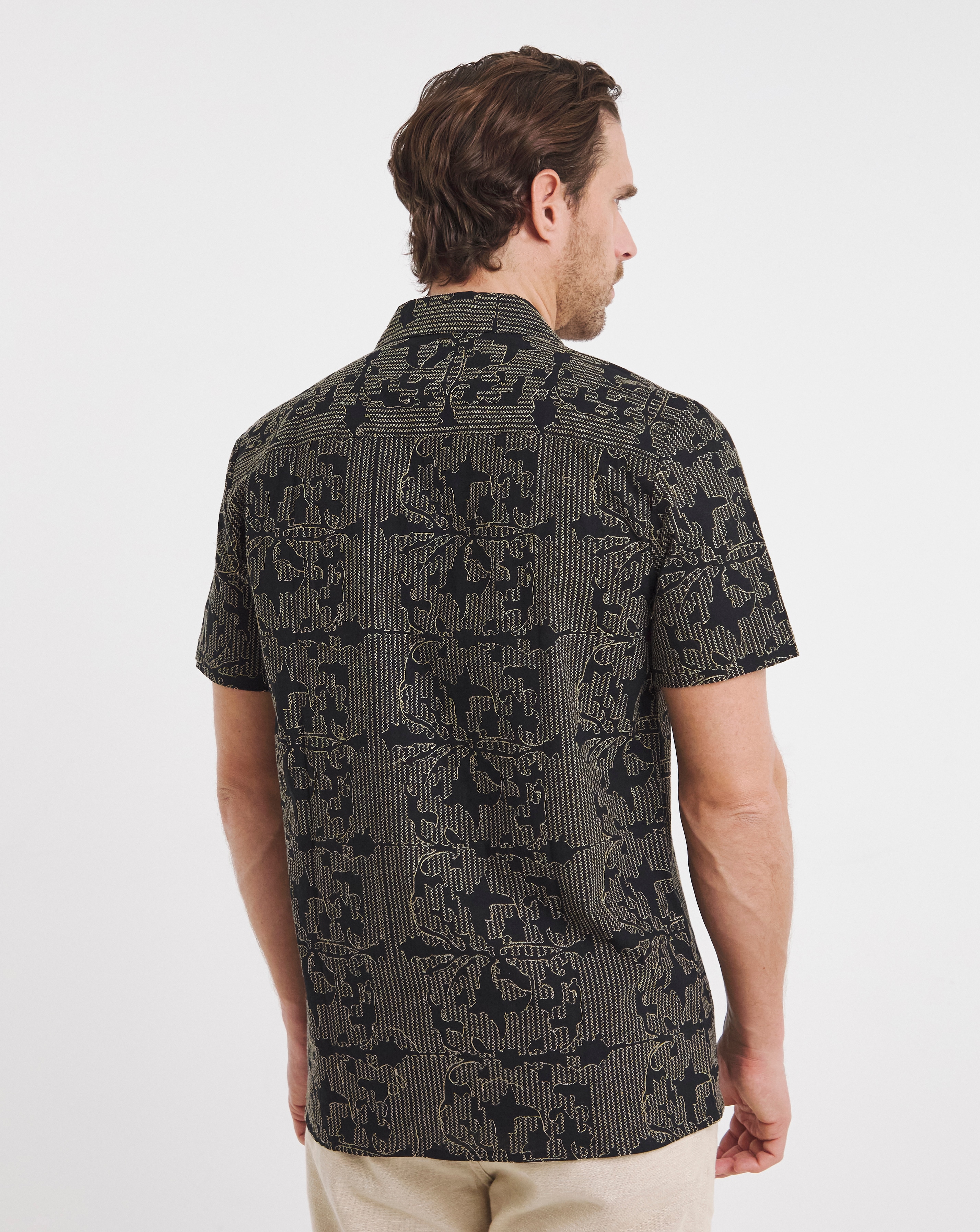 This short sleeve shirt with all-over embroidery detail is simple but oh so stylish. The monochrome colour palette brings an effortless touch of class. When you wear this sharp shirt, the party will only start when you walk in!