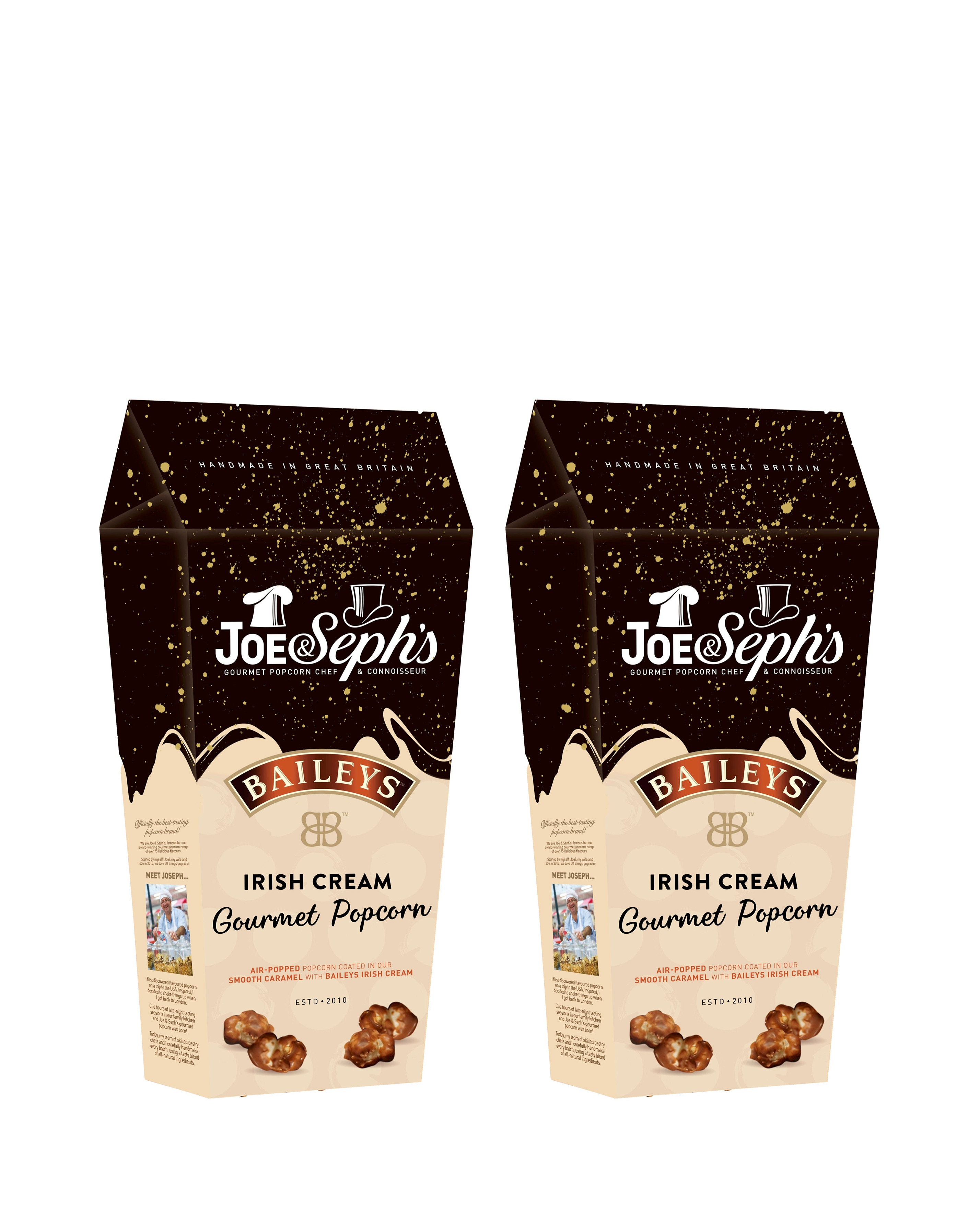 Air-popped gourmet popcorn, coated in smooth caramel with the unmistakable taste of Baileys Irish Cream. Sweet, rich, and a little bit decadent! Perfect for gifting, sharing (if you must), or treating yourself to a little moment of magic and extra indulgent movie nights. The Joe & Seph's Baileys Popcorn Gift Box Duo Pack includes: 2 x 65g Baileys Popcorn Gift Box. Suitable for Vegetarians / Gluten Free. Please note we are unable to deliver this item ROI or Northern Ireland.