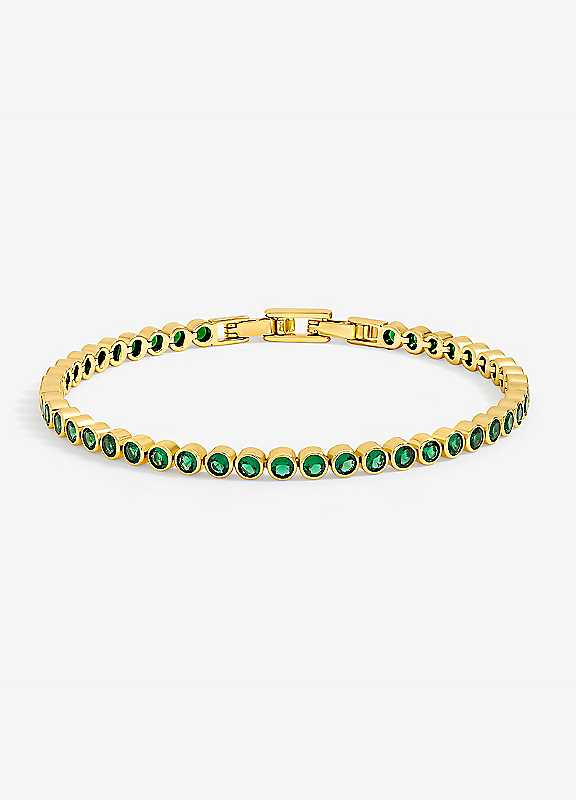 Our 14k Gold Plated and Emerald Cubic Zirconia Tennis Bracelet is a striking piece that brings classic glamour to any jewellery collection. Featuring a row of rich emerald green cubic zirconia stones set in radiant gold plating, this bracelet is perfect for adding a pop of colour and timeless elegance to both day and evening looks.Fastening: Lobster claspCostume Jewellery14K Gold Plated Base MetalWidth approx. 4 mmLength approx. 4 mm