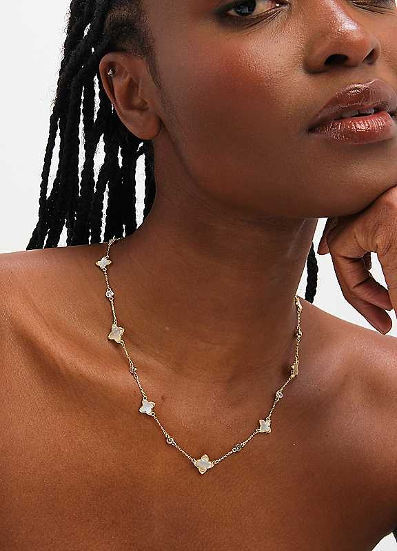 The Jon Richard Gold-Plated Mother-of-Pearl and Crystal Clover Necklace is a delicate symbol of luck and elegance. Featuring shimmering mother-of-pearl clover motifs accented with sparkling crystals, it catches the light beautifully and adds refined charm to the neckline. Perfect for bridal wear or special occasions, this necklace brings subtle sophistication and a touch of whimsical glamour to any ensemble.Fastening: Lobster claspCostume jewelleryGold-Plated Base MetalWidth size approx. 10 mmLength size approx. 8 mm | gold and pearl necklace, clover necklace, necklace with crystal, gold and crystal necklace, mother of pearl necklace