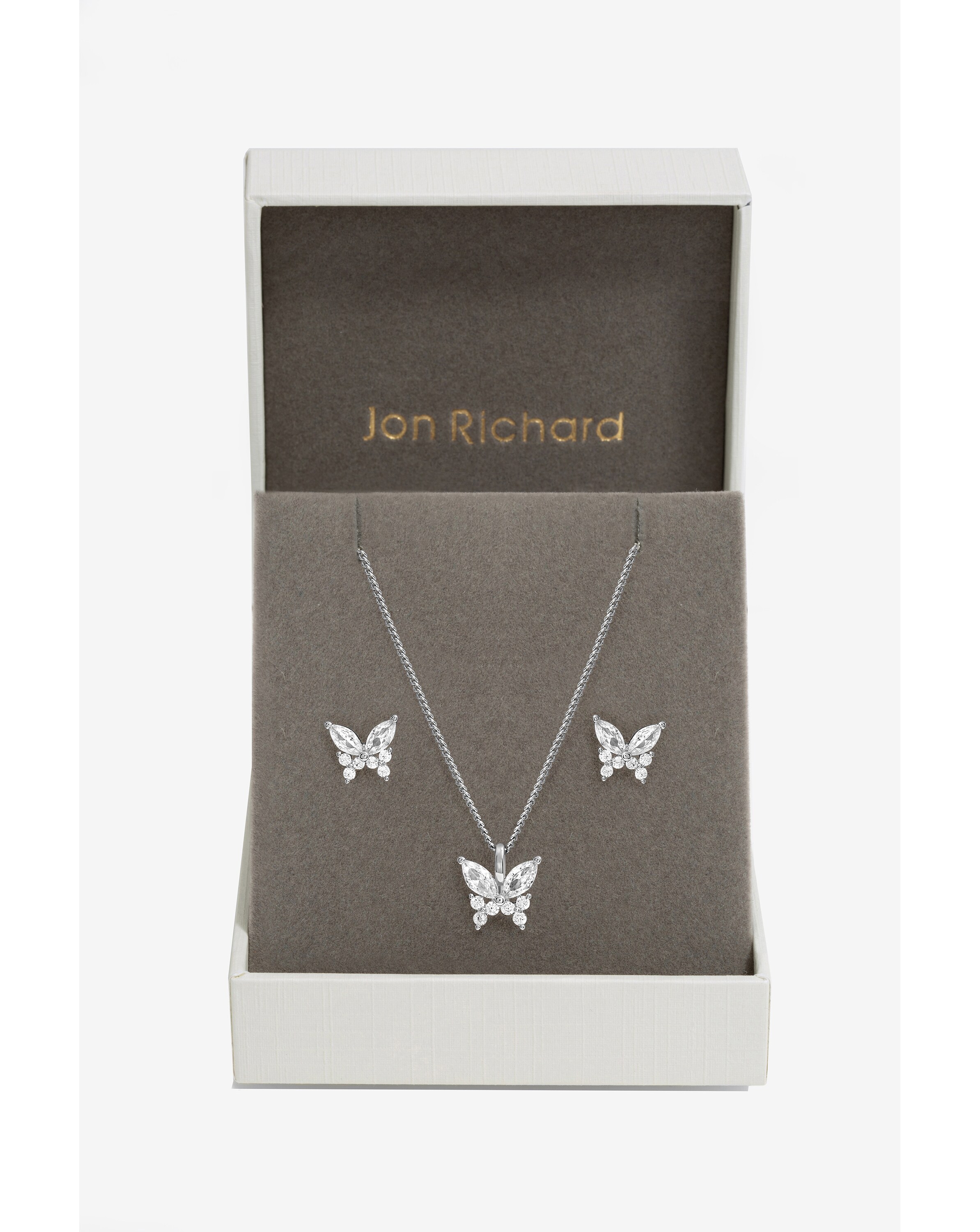 Jon Richard Rhodium Plated Cubic Zirconia Butterfly Set - Gift Boxed Our Jon Richard Rhodium Plated Cubic Zirconia Butterfly Box Set is a stunning and elegant set. Featuring a pretty butterfly design, this set includes a necklace and matching earrings, all crafted with a sleek rhodium-Plated finish. In a lovely gift box this makes a perfect gift for someone special or yourself. Fastening: Lobster Clasp. Material: Rhodium Plated Base Metal.