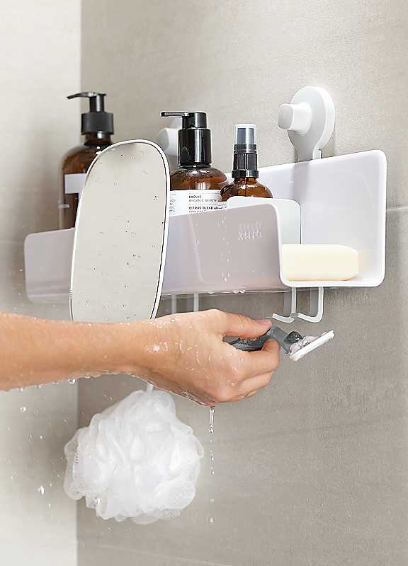 This large shower shelf takes the hassle out of shower storage. It's large enough to hold soap bars, shower gels and shampoo bottles and features hooks for razors, sponges and flannels and a hinged, removable, shatter-resistant acrylic mirror. The shelf lifts off the fixing brackets, making it very easy to clean, and it's quick and simple to install using the powerful, super-grip suction cups. This also means it's fully repositionable without damaging your wall or tiles.89.8% ABS, 3.5% TPE, 1.5% Nylon 5% PMMA. 0.2% RubberWash & dry by handDimensions approx. 15.8D x 40W x 22H cm