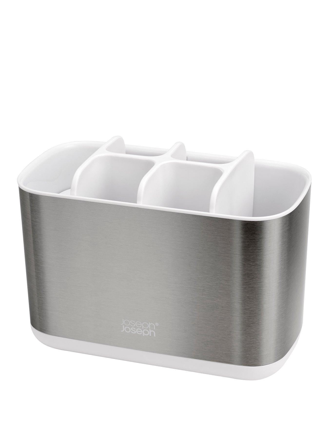 Joseph Joseph Easystore Steel Toothbrush Caddy Large This large toothbrush caddy is divided into several sections providing organised storage for a range of oral care items, including manual/electric toothbrushes, toothpaste tubes and dental floss. It has a smart stainless-steel finish and features a shallow compartment for small items, a ventilation hole for quick drying and a non-slip base. Dismantles for easy cleaning. Depth: 10 CM Height: 14 CM Material Content: ABS Width: 18 CM Suitable for storing electric/battery toothbrushes, toothpaste tubes and dental floss Stainless-steel finish with fingerprint-resistant coating Ventilated for quick drying Non-slip feet Dismantles for easy cleaning Wash and dry by hand. Do not use abrasive cloths or strong chemical cleaners.