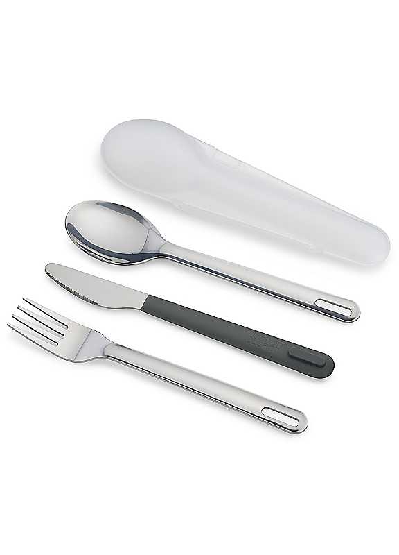Disposable cutlery performs poorly, isn't enjoyable to eat with and needs to be discarded after only one use, creating litter and contributing to the amount of waste going to landfill. Thankfully, this brilliantly compact three-piece set is the perfect alternative. It features a stainless-steel knife, fork and spoon that nest neatly together inside a rigid case for hygienic storage. Perfect for lunch-on-the-go, picnics, camping holidays or hiking trips.Set includes knife, fork & spoonReusableMade from stainless steelHandles fit together to save spaceRigid case for hygienic storageDishwasher safe48% Stainless Steel, 48% Polypropylene, 4% TPR