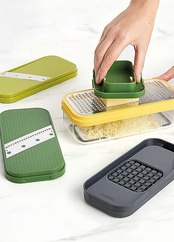 Food prep has never been easier - or neater - than with this handy, all-in-one gadget. It features a clear collecting base with four interchangeable tools that fit neatly on top, allowing you to catch prepped food as you go. The set includes a chopping blade, a slicing blade, a grating blade and a Julienne blade that are all made from stainless steel.There's also a finger guard for safety, which clips under the grater when not in use. Simply fit the tool you need to the top of the container and away you go. When finished, the 4 tools stack neatly together on top of the base for space-saving storage.Set of 44 interchangeable toolsWash by hand using a dish brushPolypropyleneDimensions approx. 1W x 1D x 1H cmCaution: Sharp blades - handle with care. Keep fingers away from blades during use and cleaning. Always store blades inside unit when not in use. Keep out of reach of children. For food preparation only - not suitable for storing food.